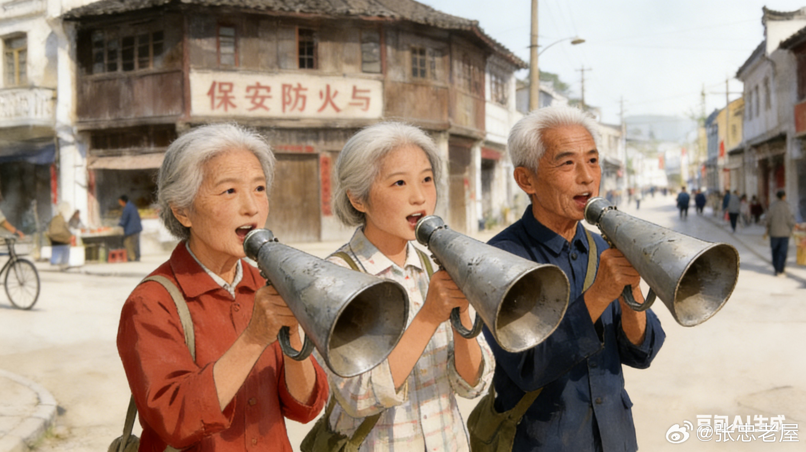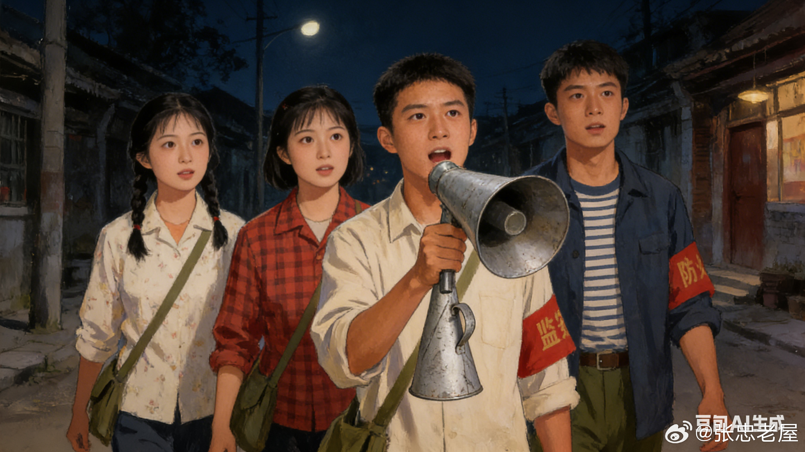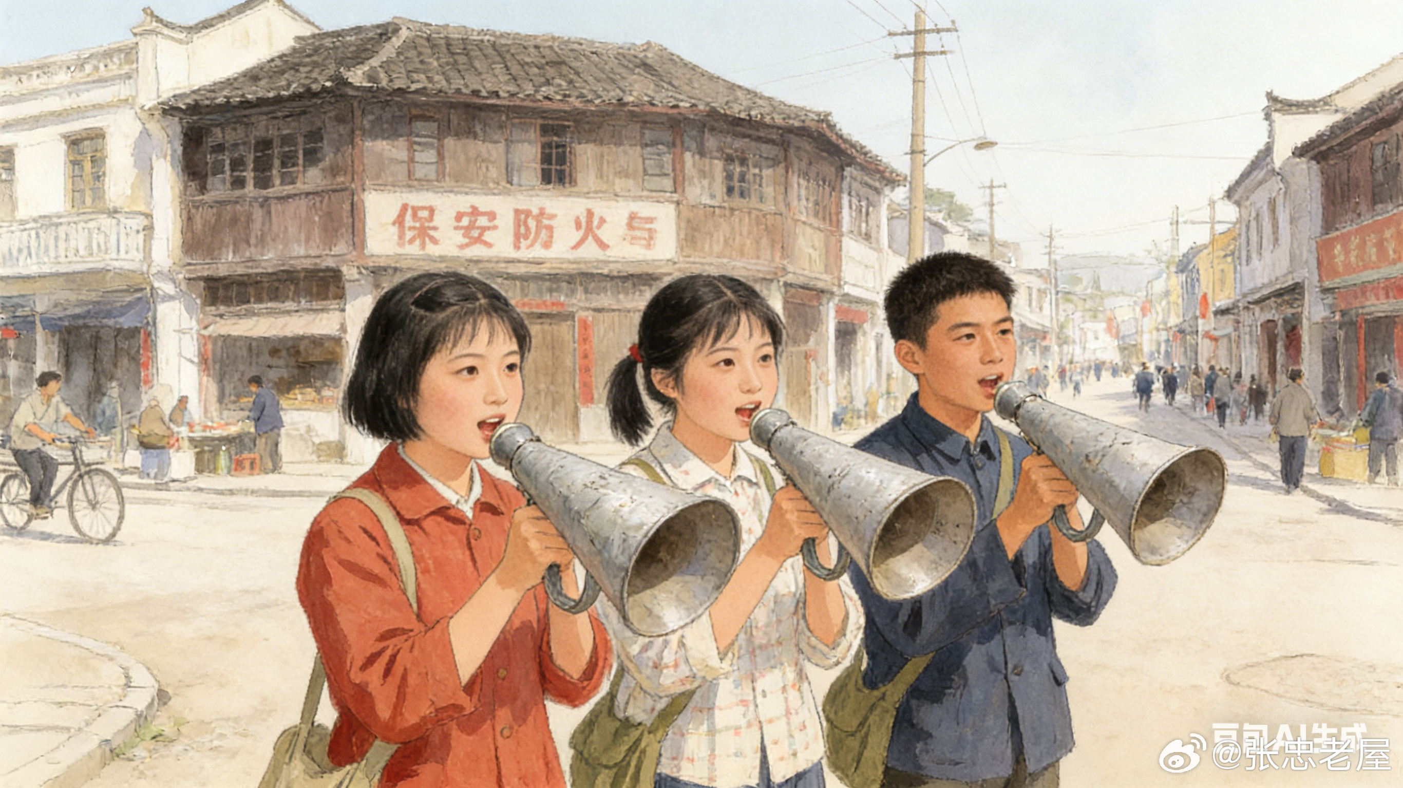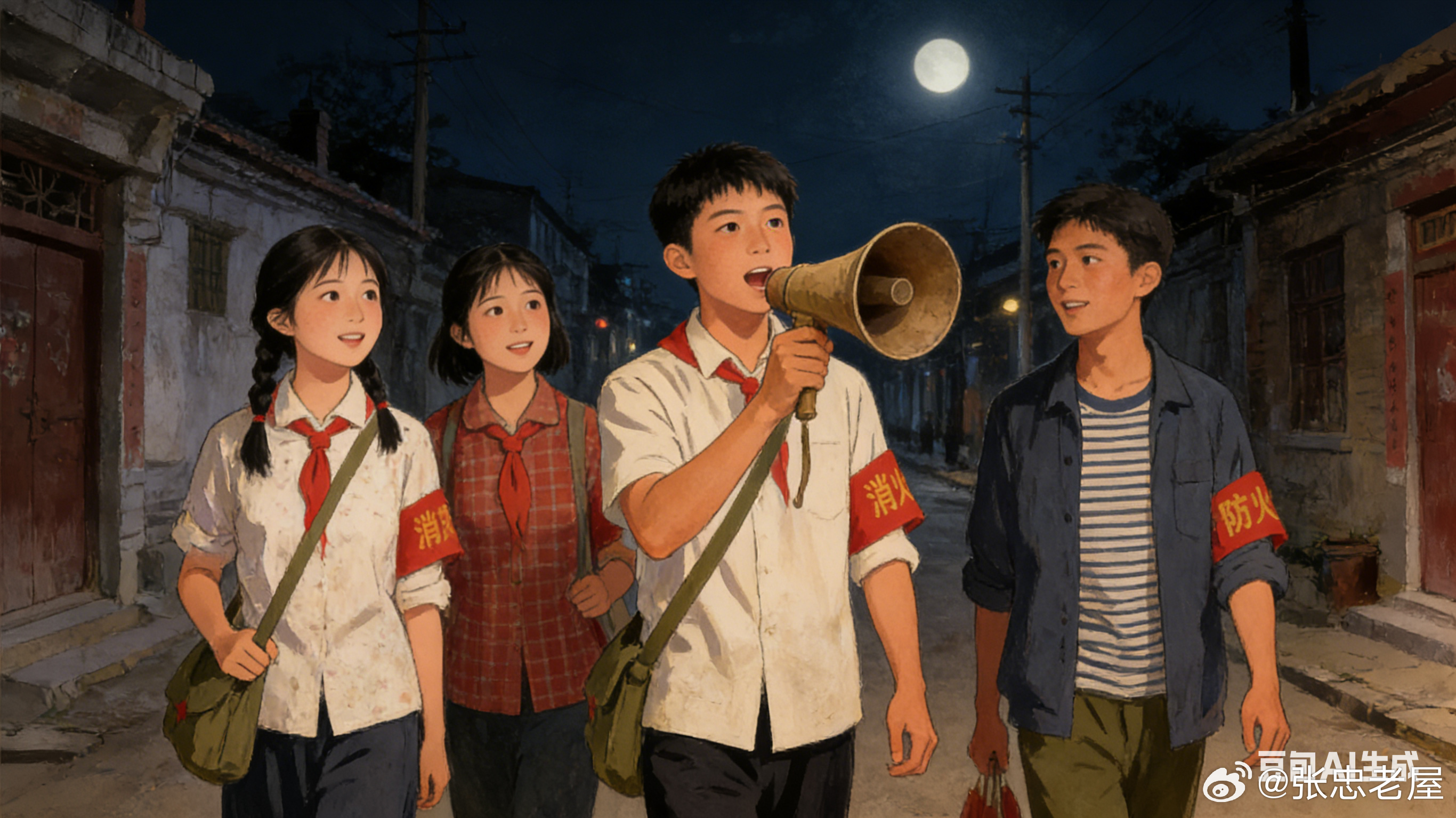 土喇叭——梦见土喇叭:◎文字:老屋张忠;//600字图片AI制作2026年初春的一天,我作了一个梦,梦里还有一个梦(梦里套梦),梦见我在东流小学五、六年级的时候,被老师喊去当志愿者,时间定在晚上和星期天,每人拿着土喇叭去街上喊话。随行的同班同学有两到三位,北街的一位女同学,东街的一位女同学,西街的一位男同学,还有一位就是住在东门岭头上的我自己(见图:四位红领巾喊话图)……