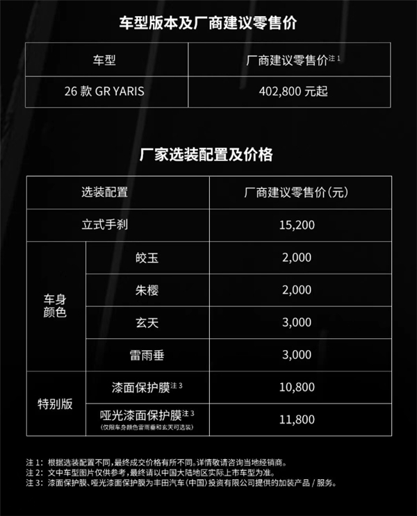 2026款丰田GR YARIS在中国上市,售价40.28万元起(较去年涨3000元)。
