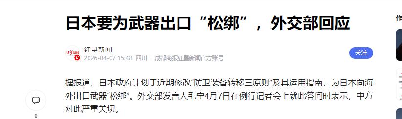 信息来源:《日本要为武器出口“松绑”,外交部回应》,红星新闻,2026年4月7日。
