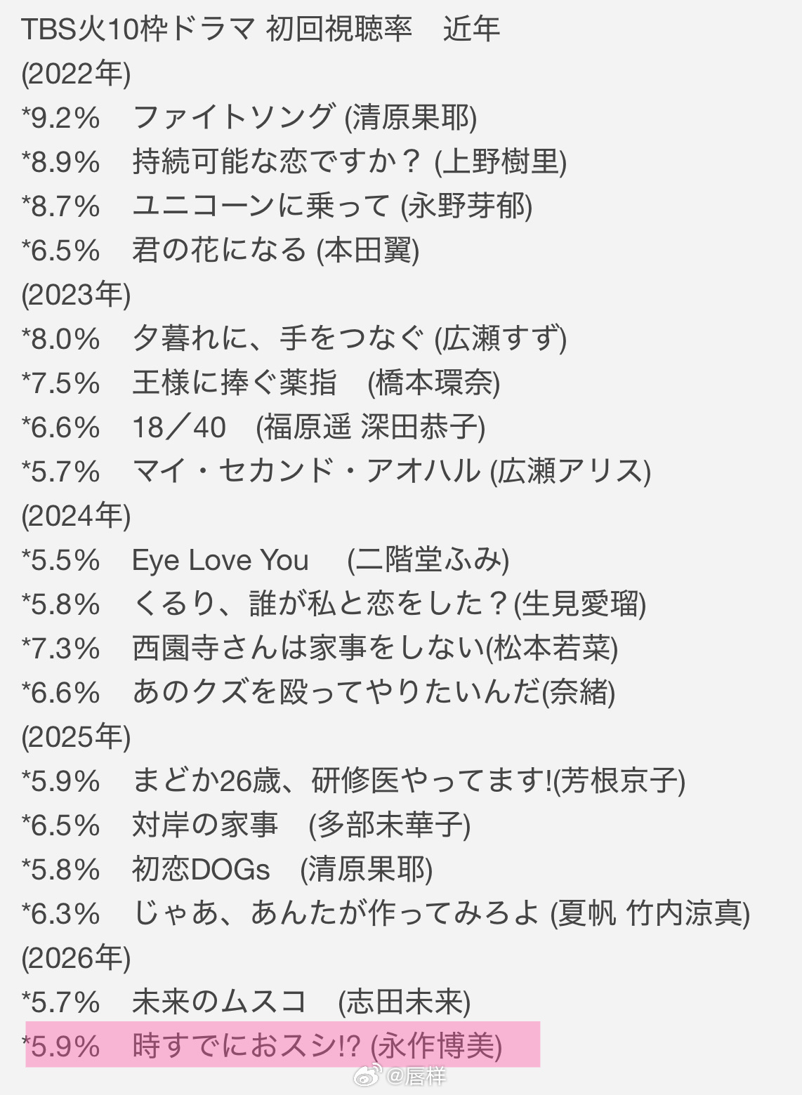 新剧开播:女演员永作博美(55)担任主演的TBS火10连续剧『为时已是寿司!?』第一集已于4月7日播出,平均世代收视率为5.9%、个人收视3.7%。