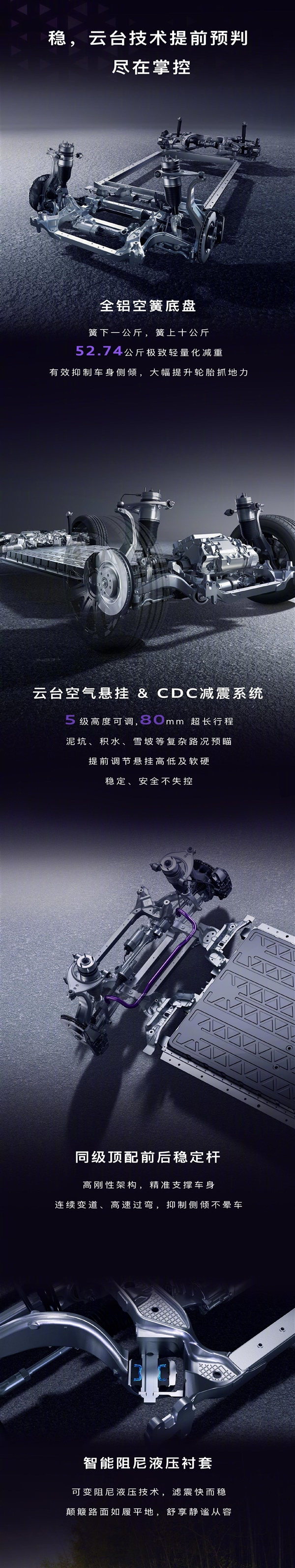 E7X依托深度调校的底盘架构实现突破:搭载quattro 2.0全时智能四驱系统(10毫秒扭矩响应,支持50:50全时分配),配备大陆空气悬架、采埃孚CDC减震及Brembo四活塞制动系统,搭配倍耐力前窄后宽鸳鸯胎(后轮285mm)与±7°后轮转向,强化抓地力与过弯灵活性。