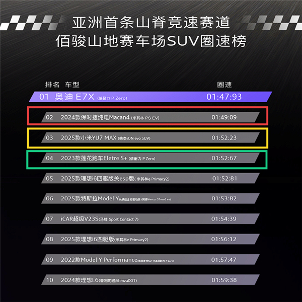 上汽奥迪AUDI E7X以1分47秒93的成绩刷新亚洲首条山脊赛道SUV组别圈速纪录,超越小米YU7 Max等竞品。该赛道以发卡弯、起伏坡度及剧烈重心转移著称,对SUV操控与稳定性构成严峻考验。