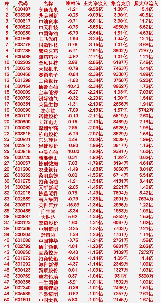 4月8日中午收盘,主力资金“大幅卖出”的50名单: