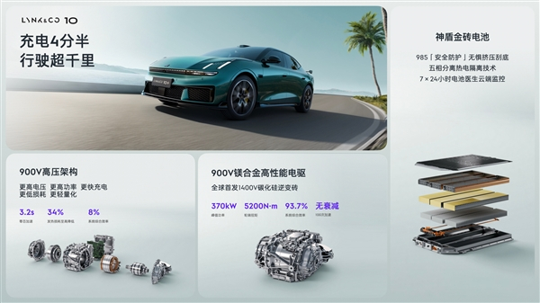 三电技术实现重大突破:领克10搭载800V 77kWh神盾金砖电池(5.5C),10.5分钟完成10%-80%充电;10+版升级900V 95kWh电池,基于V4极充桩实现10%-70%仅4分22秒、10%-97%仅8分42秒,宣称全球量产车最快充电速度。