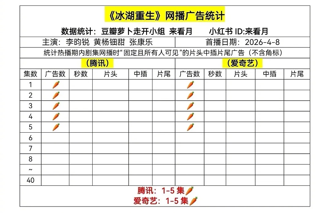 李昀锐、黄杨钿甜《冰湖重生》今日开播,万万没想到的是,金主跑得比观众还快🤣这部属于大IP➕大厂➕名导演,投资宣发都没少砸,播前已经500+热搜,ost阵容找了刘宇宁/胡夏/希林娜依高,还是大热剧续集…结果鹅桃开局1-5集全🥕,大虐!冰湖重生开局0广