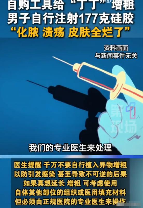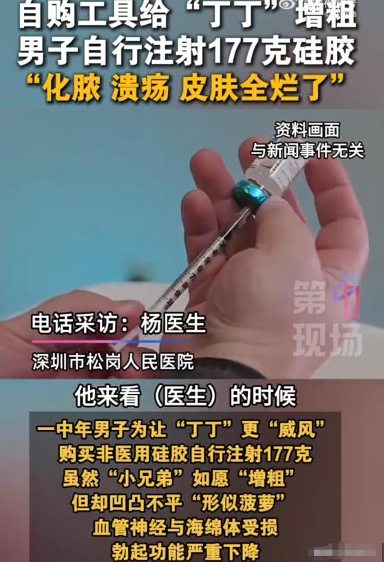 是个狠人!广东,一中年男子觉得自己现在年龄大了,房事上有些力不从心,于是心生一计,自购工具注射了177克硅胶,可大是大了,很快就出现了更严重的问题,最后只能去医院手术解决。 广东一名48岁中年男子,最近一段时间一直被一个烦恼困扰着。随着年纪越来越大,他明显感觉自己在房事上力不从心,这种无力感让他变得越来越自卑,不管在家人面前还是朋友面前,都总觉得抬不起头,心里的疙瘩越积越大。 他也知道这种情况可能是中年男性正常的生理变化,属于迟发性性腺功能减退的表现,但骨子里的好面子,让他不愿去正规医院咨询医生,更不想让身边人知道自己的困扰,生怕被人嘲笑,只能自己默默琢磨解决办法。 他在网上翻来覆去查了很多所谓的“解决妙招”,大多都是调理身体的方法,见效慢还麻烦。直到某天,他刷到一则非法注射增粗的帖子,瞬间动了心,竟荒唐地想到,往自己丁丁上注射硅胶,来达到快速增粗增大的目的。 他没多想这种操作的风险,也没意识到非医疗注射属于违规行为,只觉得这方法简单省事,不用住院、不用找医生,自己动手就能完成,还能守住隐私,花点钱就能快速解决困扰,越想越觉得可行。 打定主意后,他偷偷在网上下单了非医用硅胶材料和一套简易注射工具,还专门找了所谓的“注射速成教程”,对着教程反复看了几遍,自以为掌握了操作诀窍,完全没留意教程里模糊的风险提示。 趁着一个周末,家里人都外出办事,他关紧房门,拉上窗帘,按照教程一步步操作。全程小心翼翼,一点点将硅胶注射到目标部位,前后折腾了一个多小时,一共注射了177克,差不多相当于小半瓶矿泉水的重量。 注射结束后,他看着效果立竿见影,丁丁明显变大变粗,心里瞬间松了口气,暗自窃喜自己找对了法子,终于能摆脱之前的自卑,甚至开始幻想后续能恢复往日状态,完全没察觉危险正在悄悄降临。 可这份窃喜没能持续多久,仅仅过了三天,他就发现身体出现了异常。注射部位开始发红发热,摸起来滚烫,还伴随着钻心的疼痛感,而且硅胶分布得十分不均,表面凹凸不平,摸起来疙疙瘩瘩,看起来十分怪异。 他试着用温水清洗、涂抹普通消炎药,可情况不仅没有好转,反而越来越严重。又过了两天,注射部位开始化脓溃烂,还散发出刺鼻的腐臭味,哪怕反复清洗,臭味也无法消除,疼得他坐立难安,连正常走路都成了难题。 实在扛不住的他,再也顾不上羞耻,匆匆穿上衣服,打车赶往附近的医院就诊。医生看到他的情况,当场就判断是注射非医用硅胶引发的严重排异和感染,部分皮肤已经缺血坏死,必须立刻手术取出硅胶。 手术整整进行了两个多小时,医生才将他体内177克硅胶全部取出,还对感染坏死的组织进行了彻底清理。据悉,今年市面上劣质非医用硅胶充斥,这类材料含杂质,注射后极易引发并发症,且无法被人体吸收,只能手术取出。 术后男子躺在病床上,不仅要承受伤口的疼痛,还要支付高额的手术费,原本想解决困扰,没想到反而遭了大罪,还留下了后遗症。他也终于明白,非法注射的风险远超想象,一时的侥幸,换来的却是无尽的麻烦。 对此,你们有什么看法,欢迎评论留言~