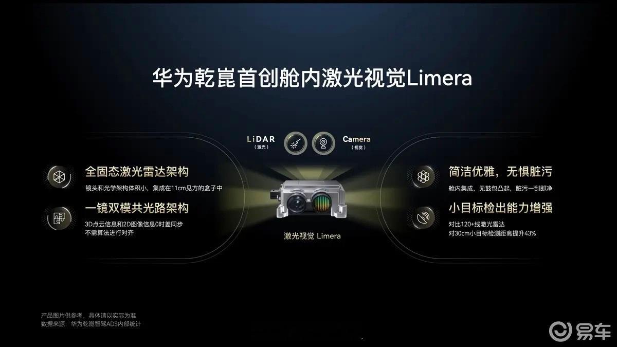 华境S,宁德时代电池,华为乾崑首创的舱内激光视觉Limera。还有一体式热成型双