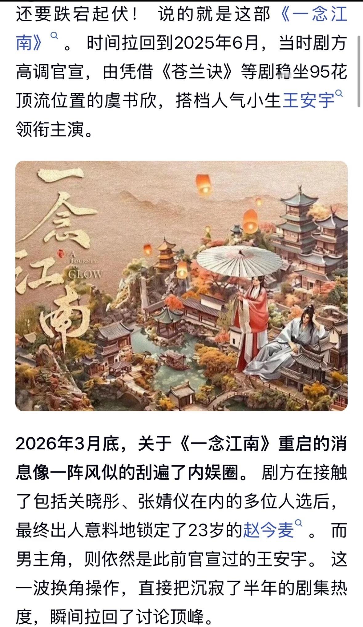 一念江南最后确定了赵今麦和王安宇,说实话这俩人可以搭现偶和年代,唯独不太适合古装,不太懂这个选角。女主从之前的虞书欣到关晓彤,再到张婧仪,再到最终确定的赵今麦,男主一直是王安宇。