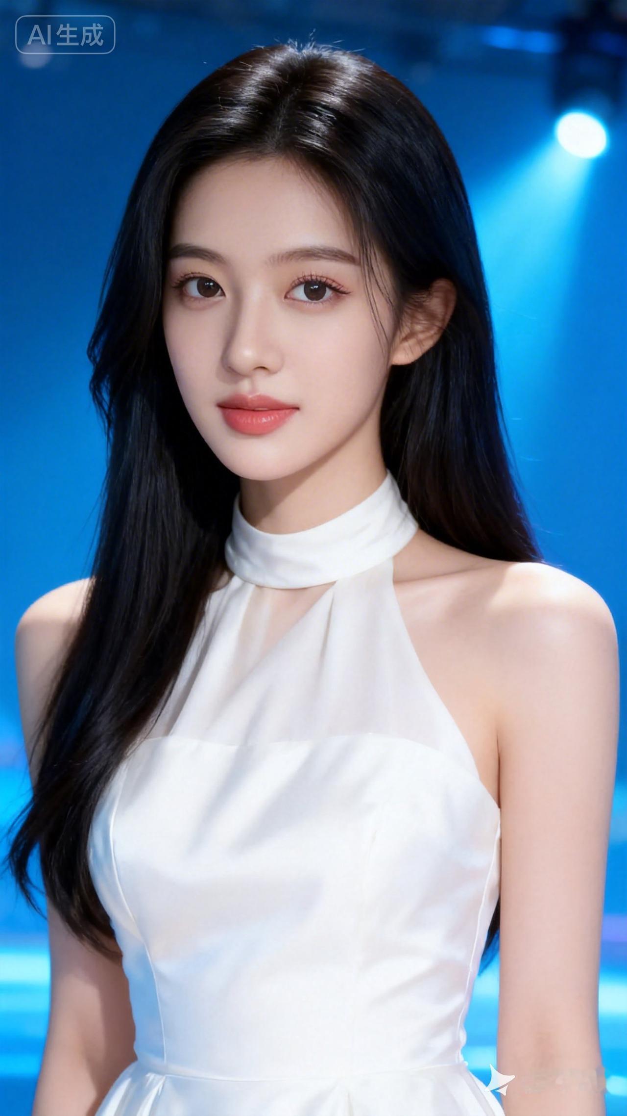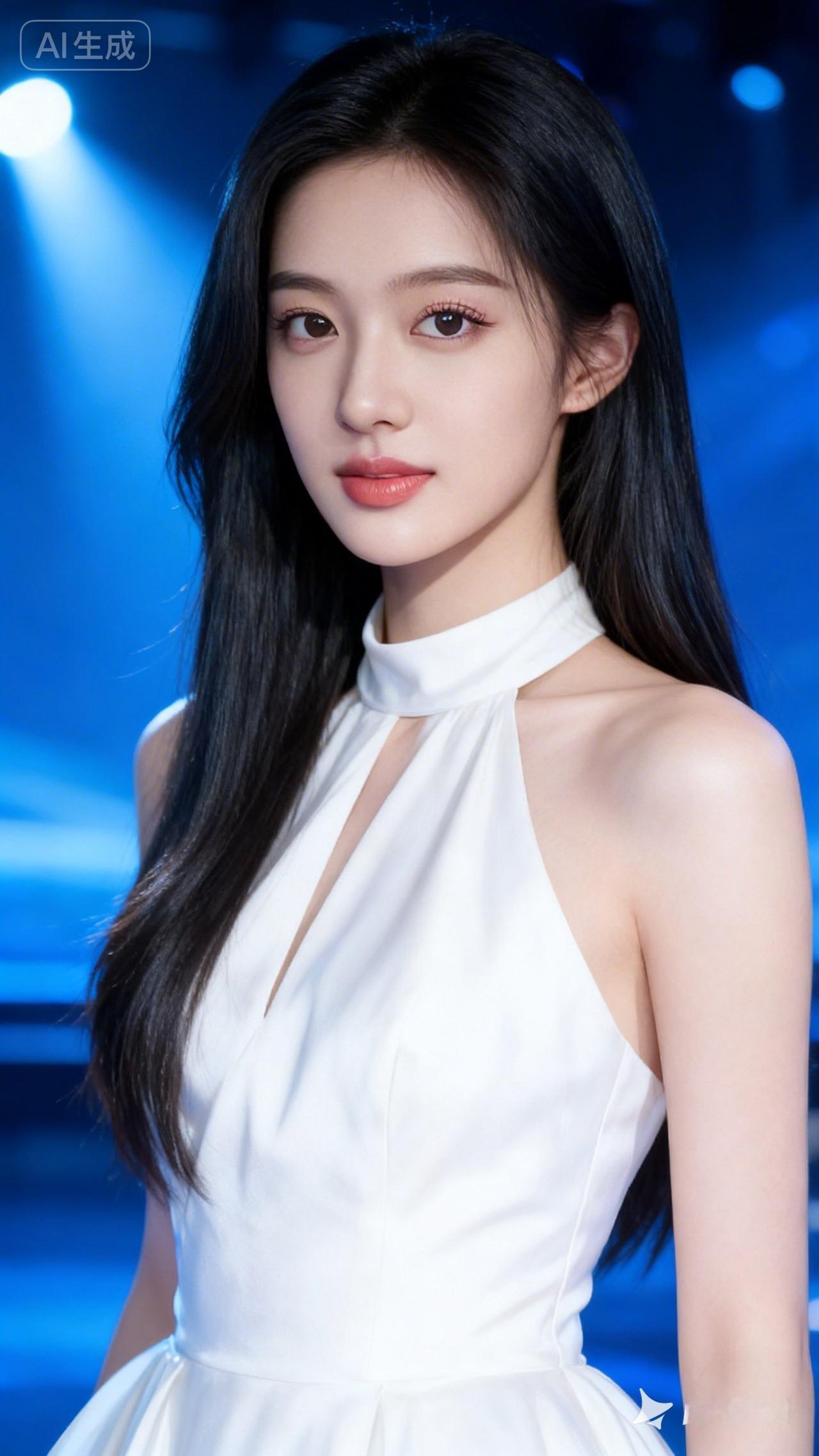 温柔甜美的白裙少女,梦幻的蓝色背景,尽显优雅气质。