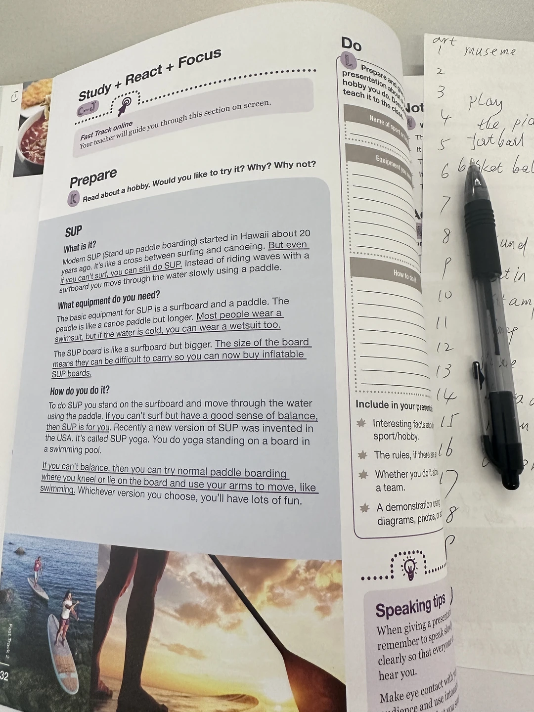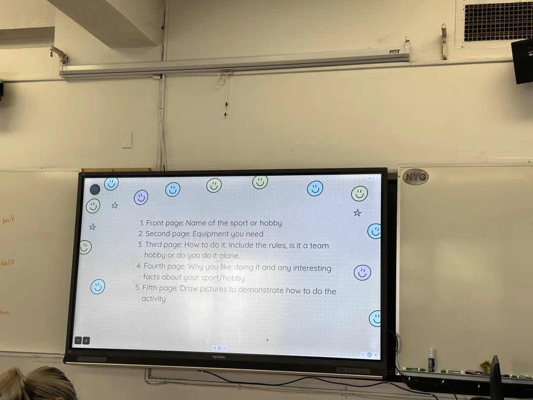 休息十分钟后开启第二节课,老师又是发给每个人一张纸,让我们把纸折三折,这样就分出了六面,还给我们安排了满满的任务:第一面写自己喜欢的运动或爱好,第二面写这项爱好所需要的装备,第三面写具体怎么做、是团队活动还是独自一人玩,第四面写为什么喜欢它、有什么相关的有趣小事,第五面要求亲手画一副画,描绘出做这项运动的样子。大家都低头认真书写、画画,教室里特别专注,等所有人完成后,轮流上台对着自己的作品分享,既能梳理思路,又狠狠锻炼了大家的表达能力,课堂氛围超棒~