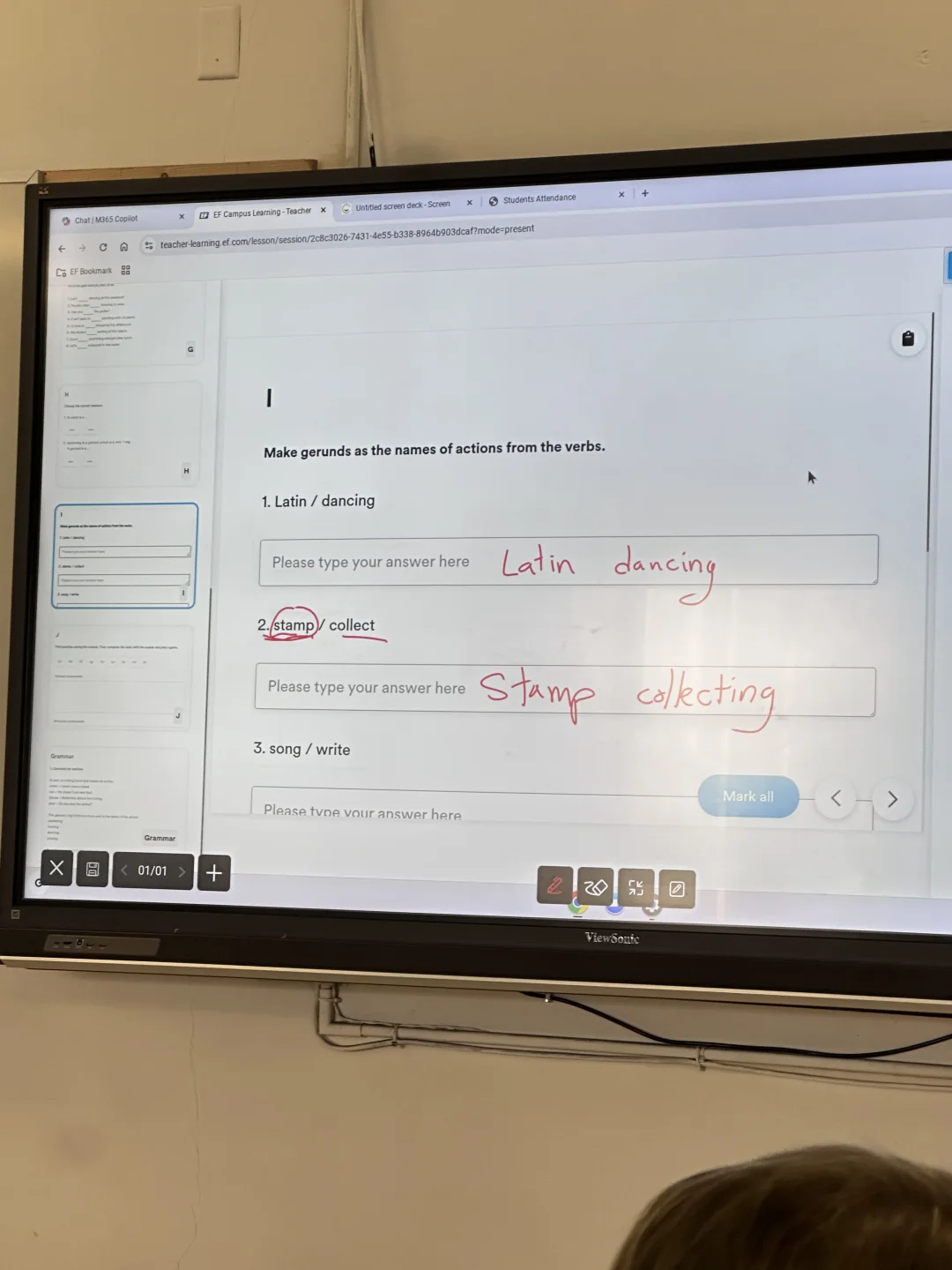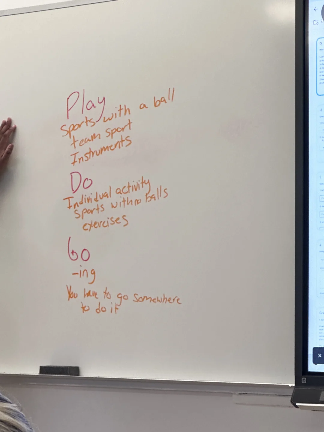 后半节课开始讲重点语法,先播放视频讲解go、play和do的用法区别,视频里的讲解直白好懂,看完后老师安排了随堂练习,让我们做题巩固知识,错题当场纠正,最后还学习了动名词相关的知识点,干货满满,一节课过得飞快,完全没觉得枯燥。