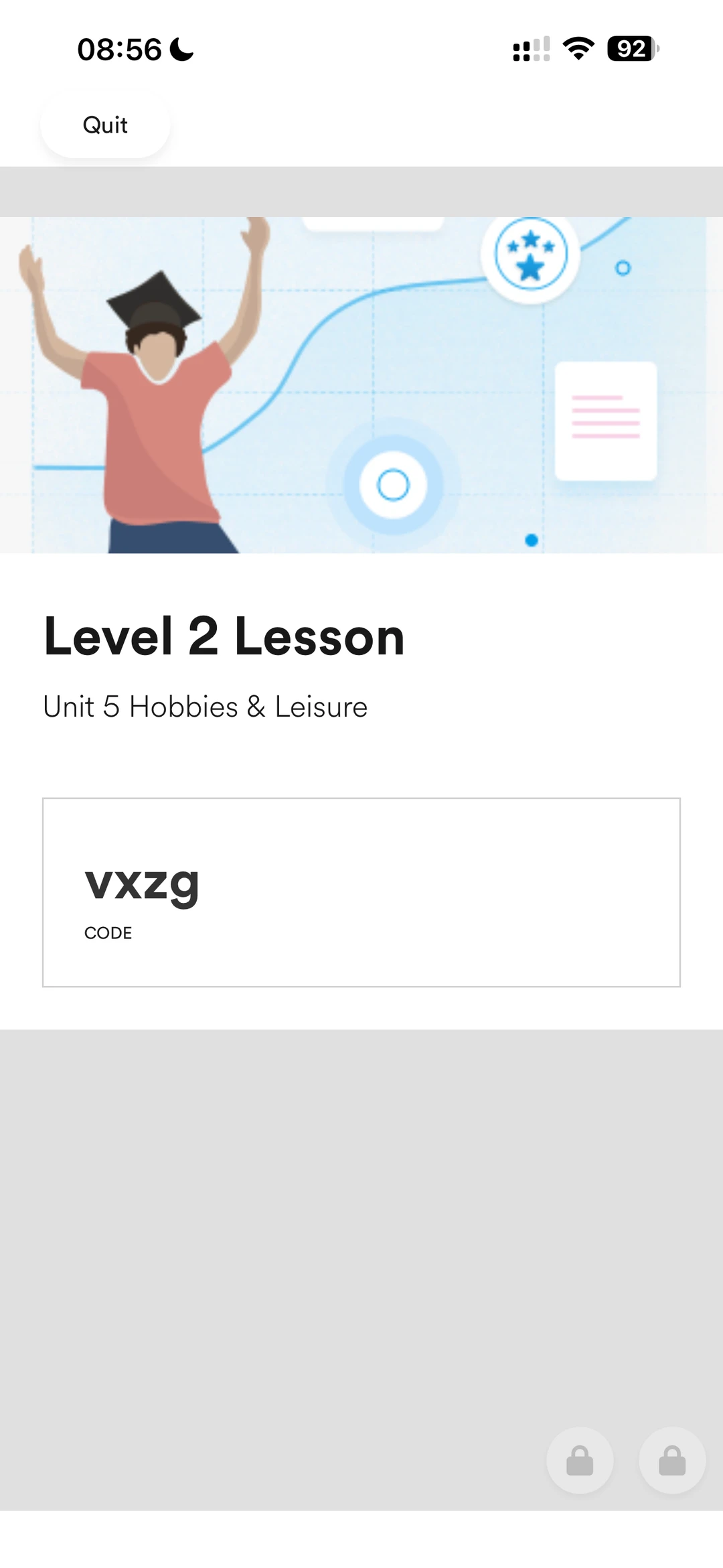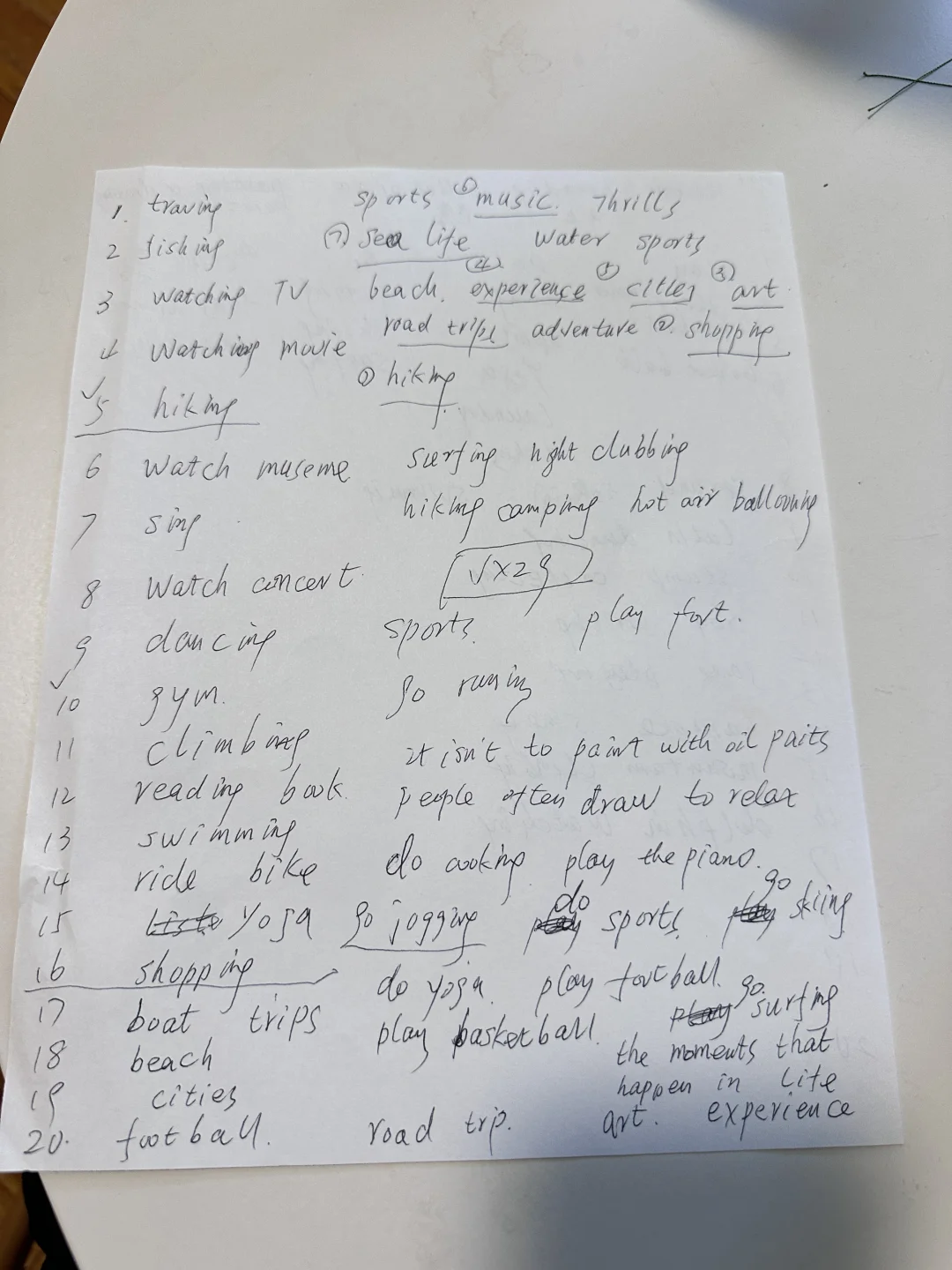 老师先带我们解锁了EF Learning App,一步步教我们输入专属code,顺利进入今天的学习内容,操作起来特别简单。随后给大家发了一张白纸,只给2分钟限时,让我们快速写出二十个运动或娱乐活动相关的词汇,我脑袋飞速运转,大概写了十六个,紧接着老师播放了一段趣味视频,里面全是各种各样的娱乐活动画面,我们跟着视频,把刚才没想到的词汇补充在白纸上,之后让大家说说自己最喜欢的活动,轻松打开话匣子。