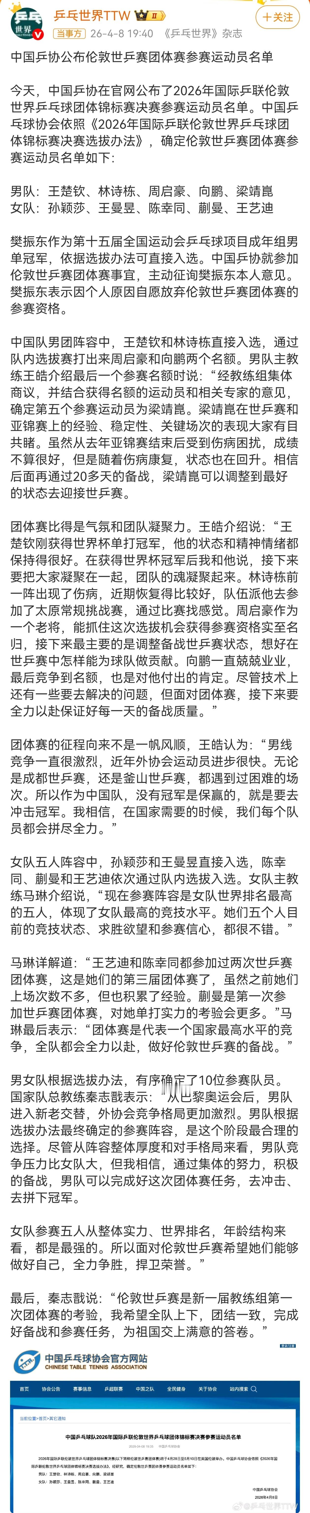 4月8日,中国乒乓球协会在官方网站正式公布2026年伦敦世界乒乓球团体锦标赛决赛参赛运动员名单。依据选拔规则,樊振东可直接入围,在名单确定过程中,中国乒协专门就参赛事宜主动征询了樊振东本人的意见。最终,樊振东自愿放弃参赛资格,将名额留给队内其他选手。樊振东放弃伦敦世乒赛资格秦志戬回应伦敦世乒赛名单依照最终公布的名单:中国男队此次出征伦敦世乒赛团体赛的选手为王楚钦、林诗栋、周启豪、向鹏、梁靖崑;女队则由孙颖莎、王曼昱、陈幸同、蒯曼、王艺迪组成。