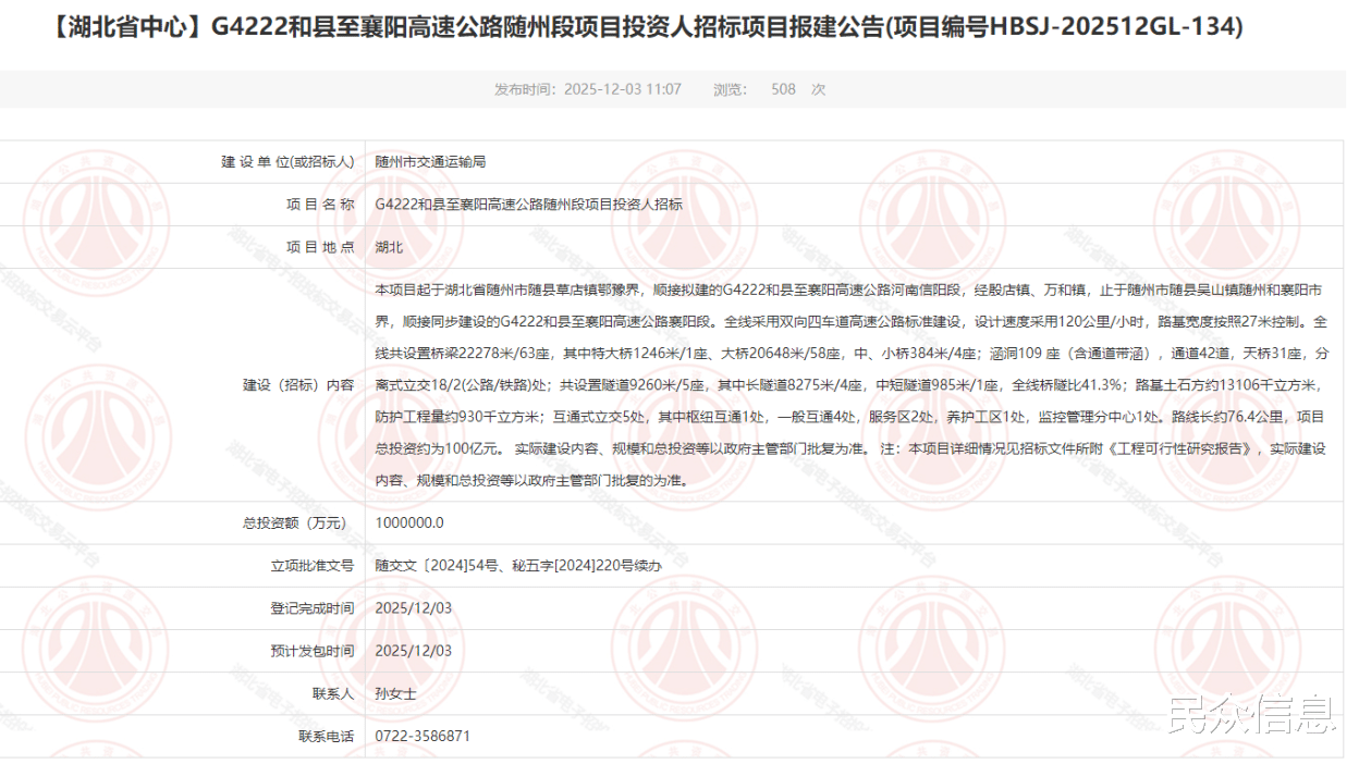 近日,湖北省公共资源交易中心发布G4222和县至襄阳高速公路随州段项目投资人招标公告,这标志着和襄高速湖北段即将进入施工建设阶段。和襄高速河南段(全长约204公里)的建设与和襄高速湖北段的协同规划,预计至2029年实现全段通车。预计2026年动工建设。