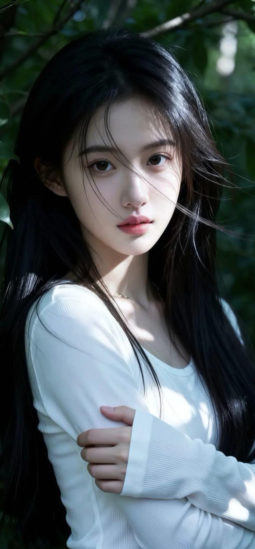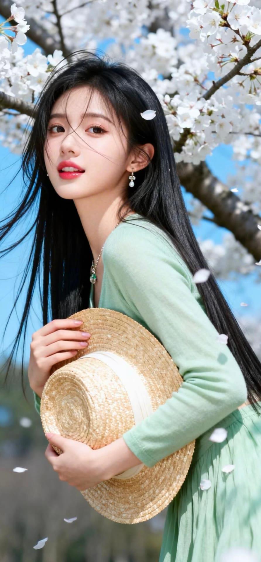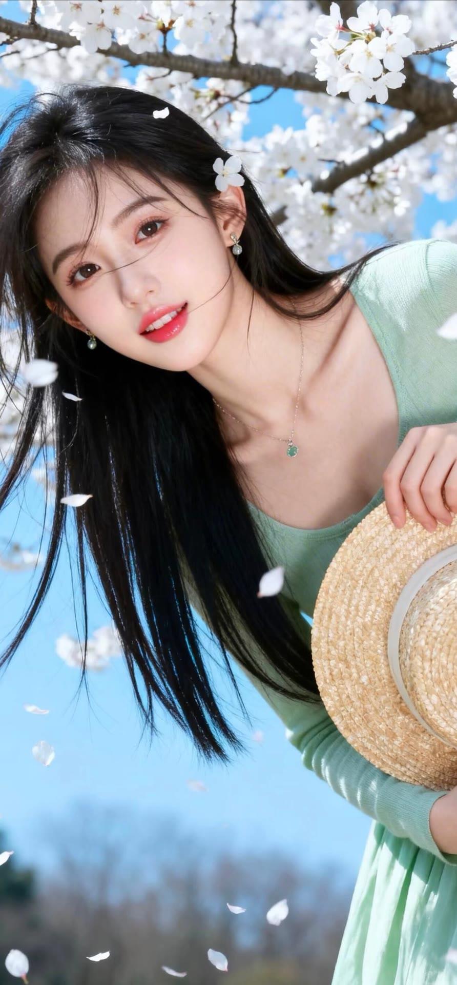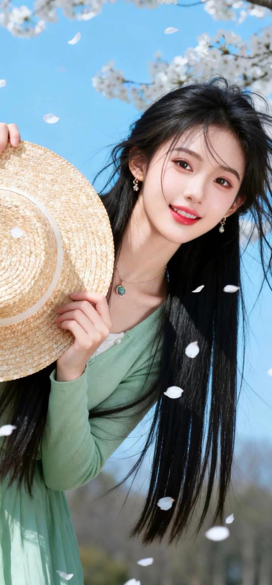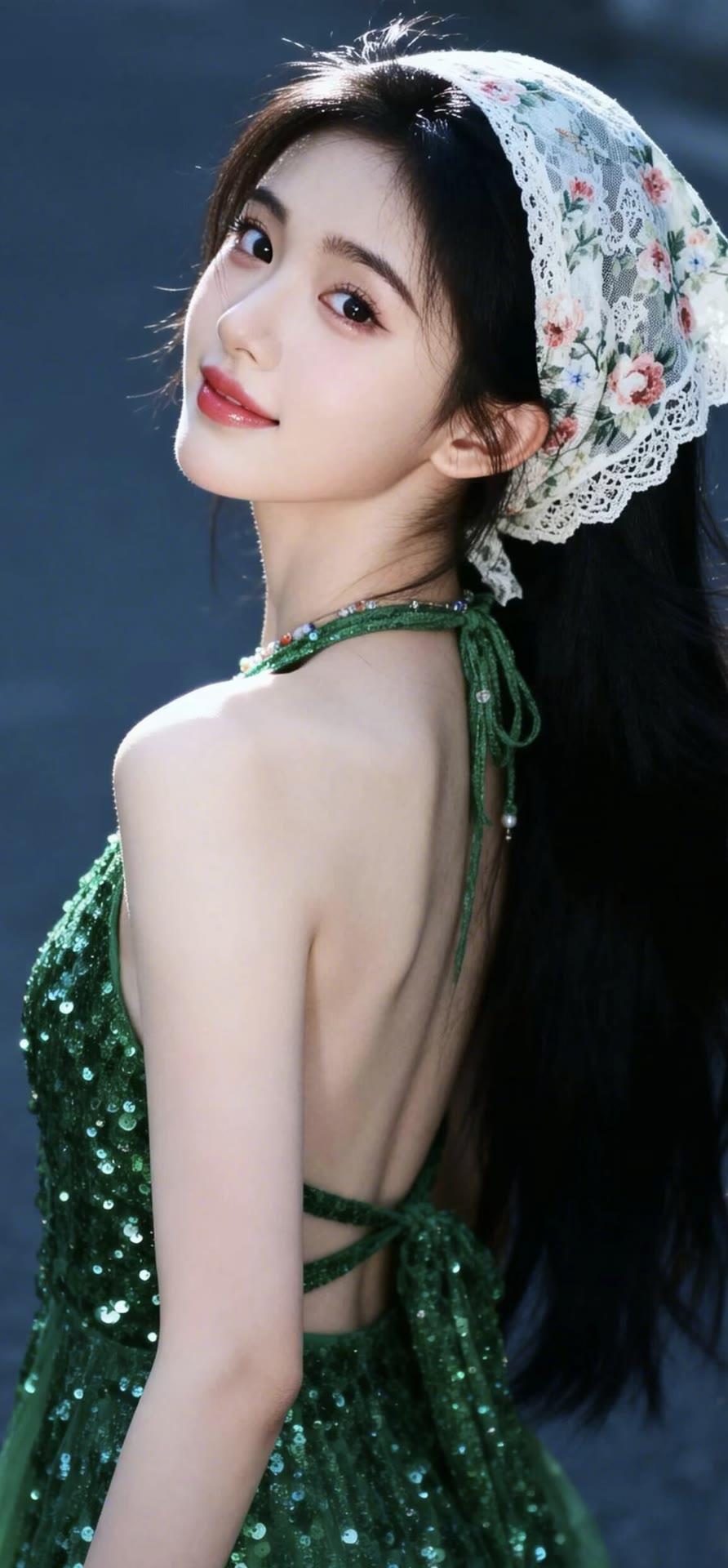 甜美少女,绿裙花边,温柔微笑,梦幻可爱