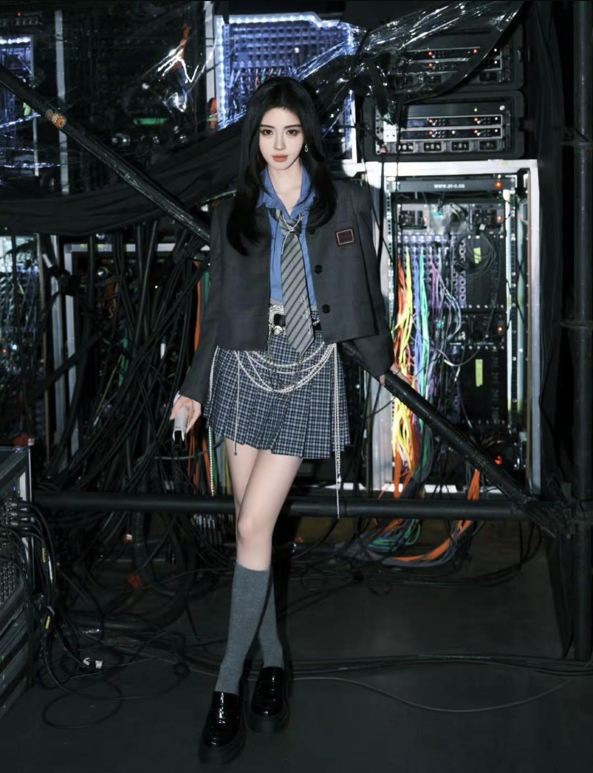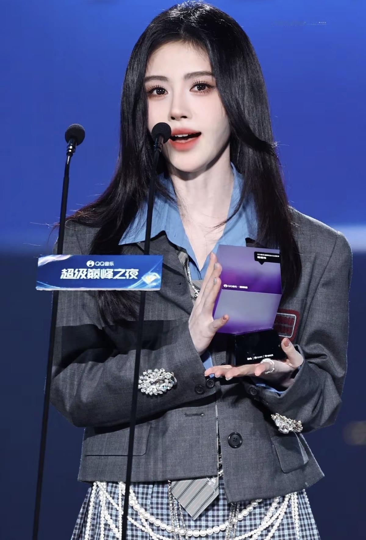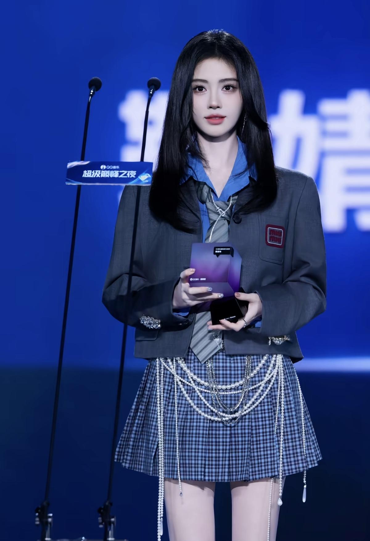 谁能拒绝鞠婧祎的学院风造型!灰西装+格纹裙+珍珠腰链,把甜酷感焊在身上,领奖台上