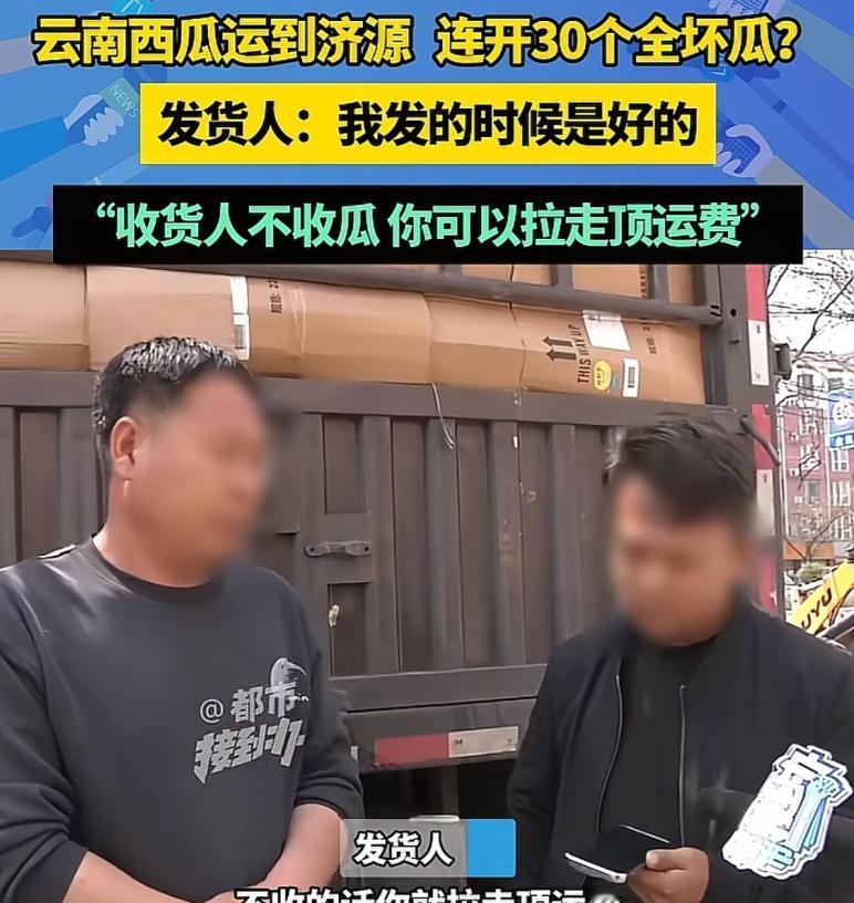 男子从云南运了18吨西瓜到济源,可收货方一检查,连开了30个瓜,外面都是好好的,可里面的瓤都是坏的,说什么都不肯结算运费了。男子的车也走不了,联系发货方,发货方却说如果对方不收,那就让男子把西瓜拉走顶运费。男子傻眼:这都是坏了的瓜,我拉去卖给谁,猪都不吃。