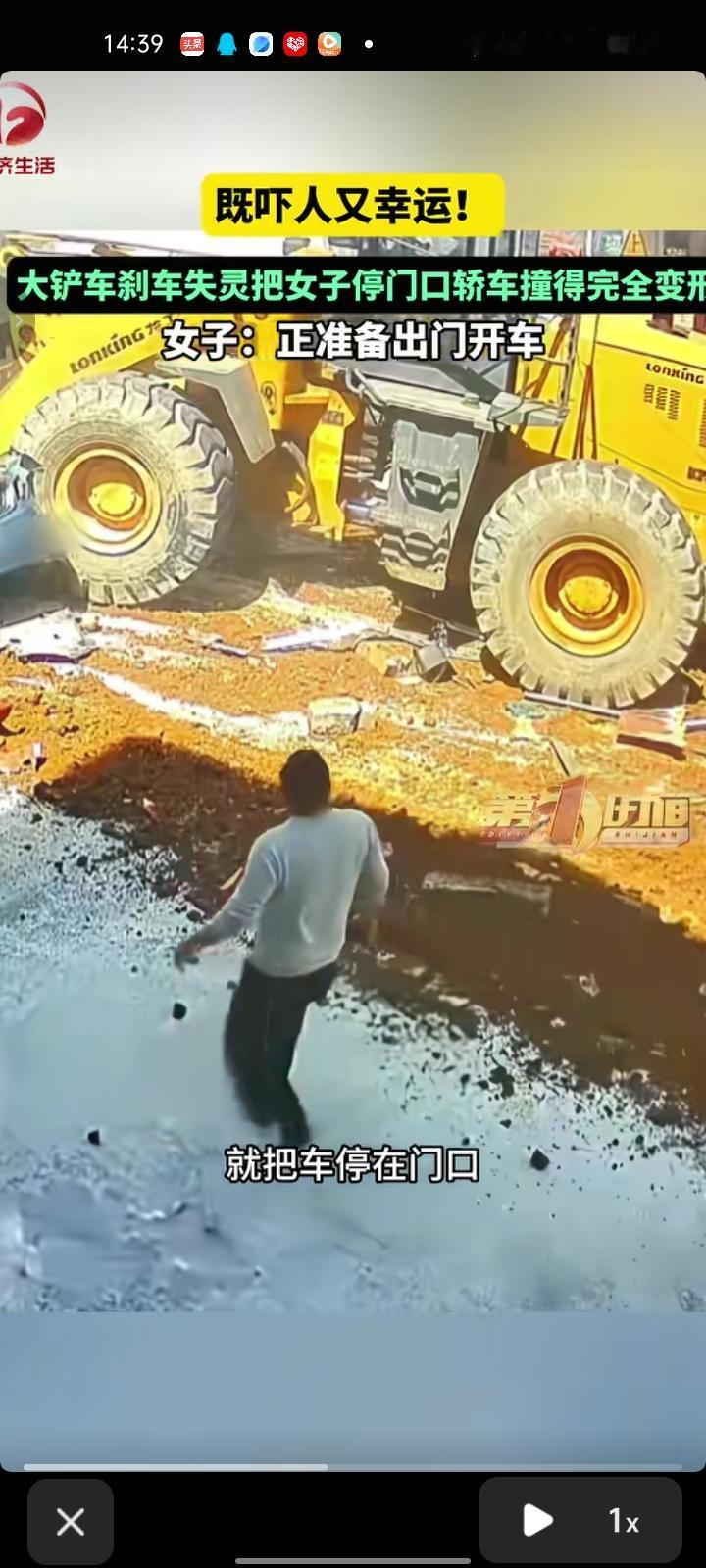 4月4日,贵州铜仁。监控记录惊险一幕,大铲车下坡时突然刹车失灵,撞毁一辆停在门口的轿车。