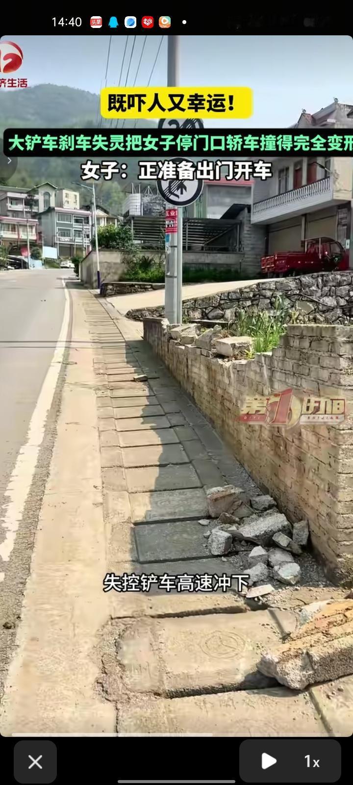 4月4日,贵州铜仁。监控记录惊险一幕,大铲车下坡时突然刹车失灵,撞毁一辆停在门口