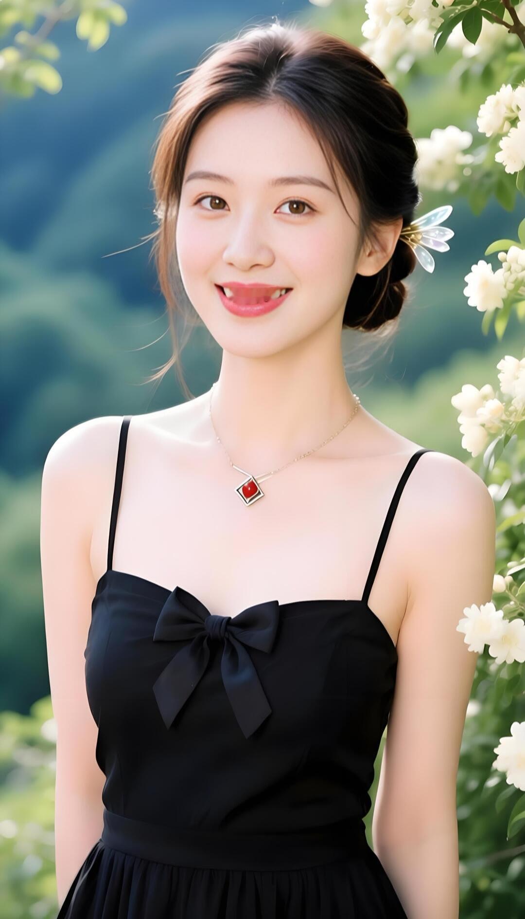 花间美人笑,黑裙映芳容。
