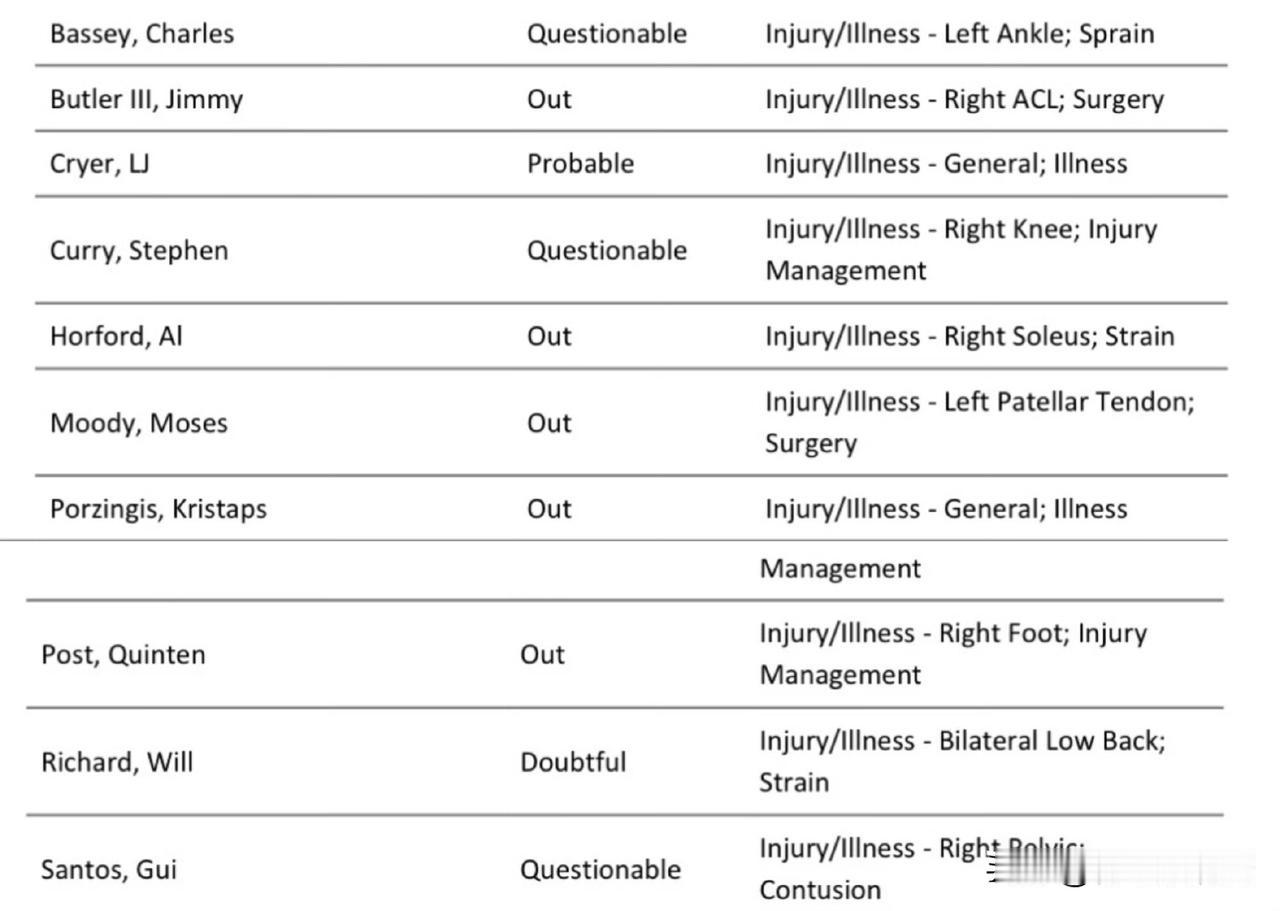 巴特勒、霍福德、穆迪、波尔津吉斯、波斯特都确定无法出战;巴锡、库里、桑托斯的状态为出战成疑;克赖尔大概率出战,理查德25%可能出战。