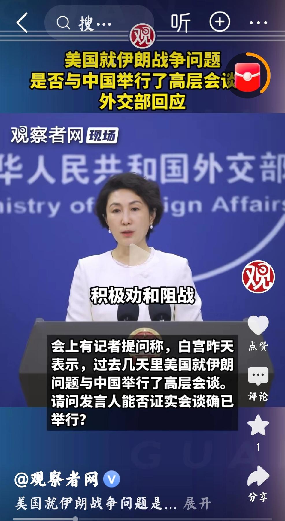 2026年,4月9日,外交部发言人回应,“美国就伊朗战争问题,是否与中国举行了高层会谈”中方:“积极劝和阻战,通过政治外交途径化解争端,平息战火”