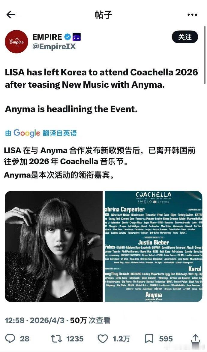 Lisa四登科切拉科切拉最大悬念揭晓!Lisa 空降 Anyma,四登舞台稳了Lisa将空降科切拉