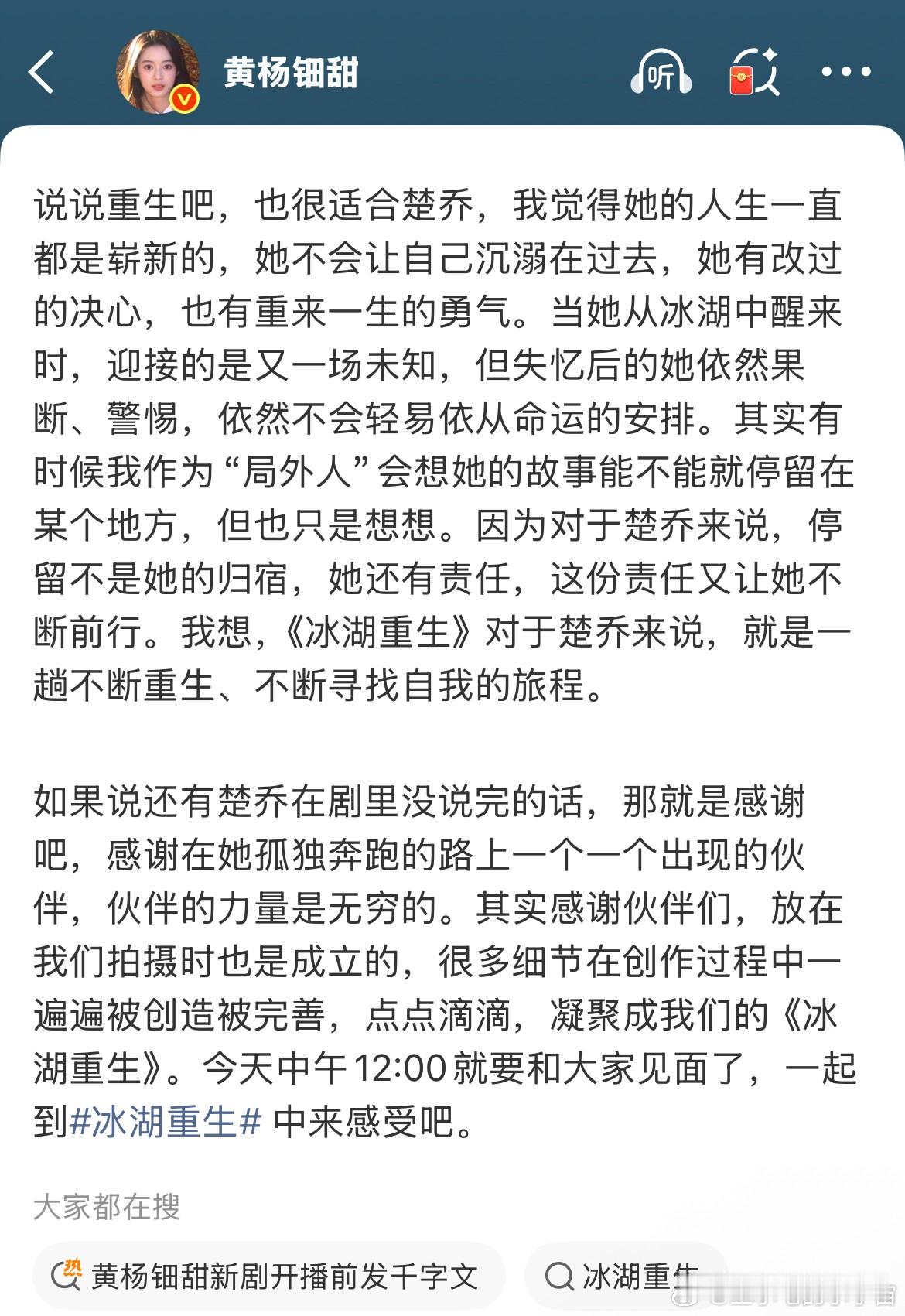 《楚乔传2》开播,黄杨钿甜发长文分享楚乔带给她的力量,给网友看笑了!纷纷留言,大小姐辛苦了!耳环太闪了!亮得不想看,互联网是有记忆的,网友也有!
