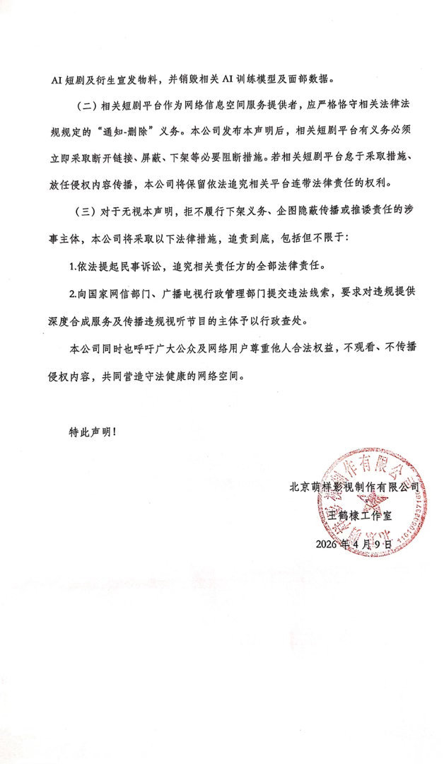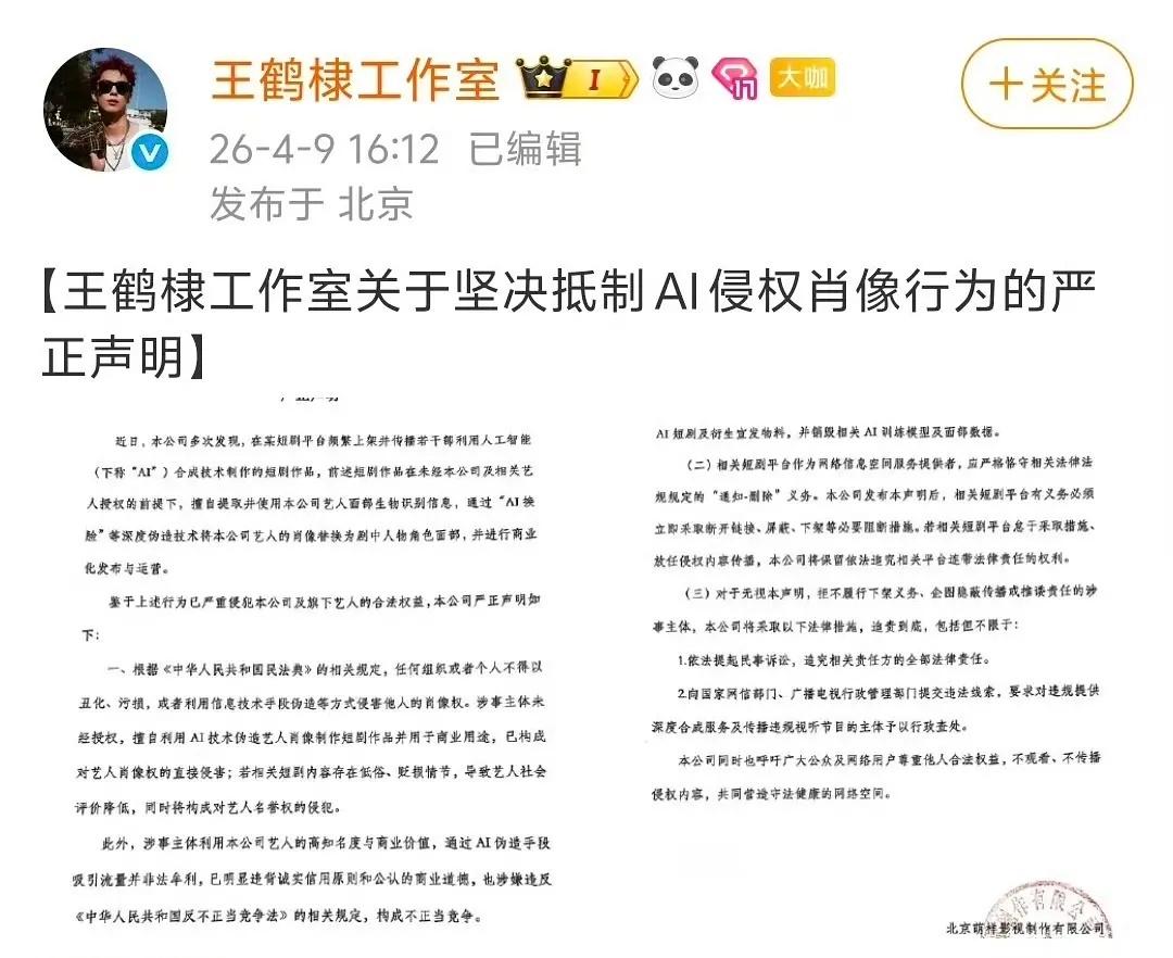 王鹤棣王鹤棣工作室抵制AI侵权肖像声明这个必须支持,现在AI融脸、换脸真的太滥用了