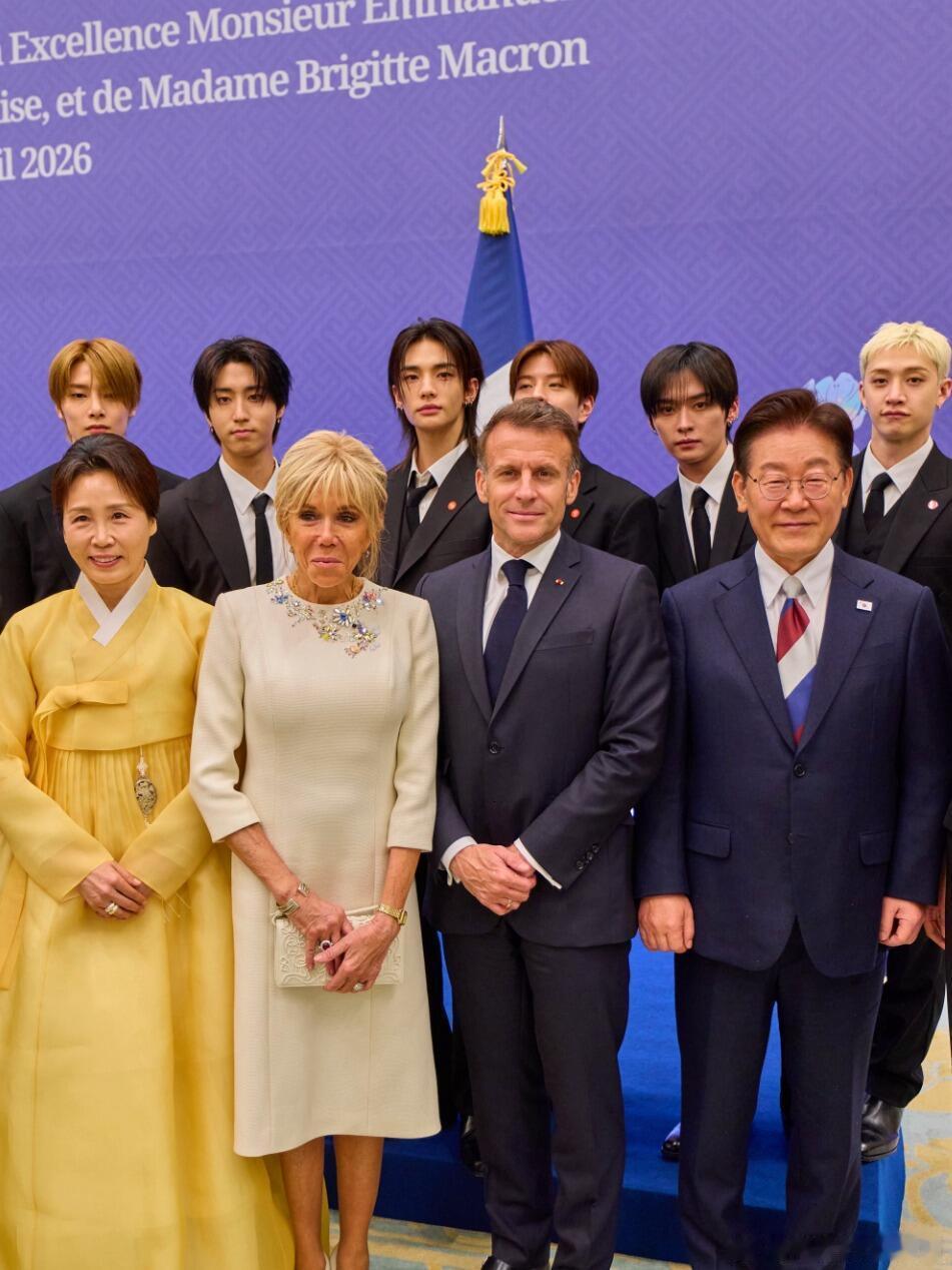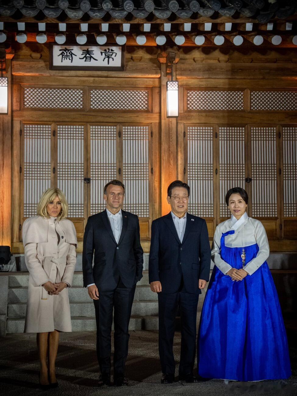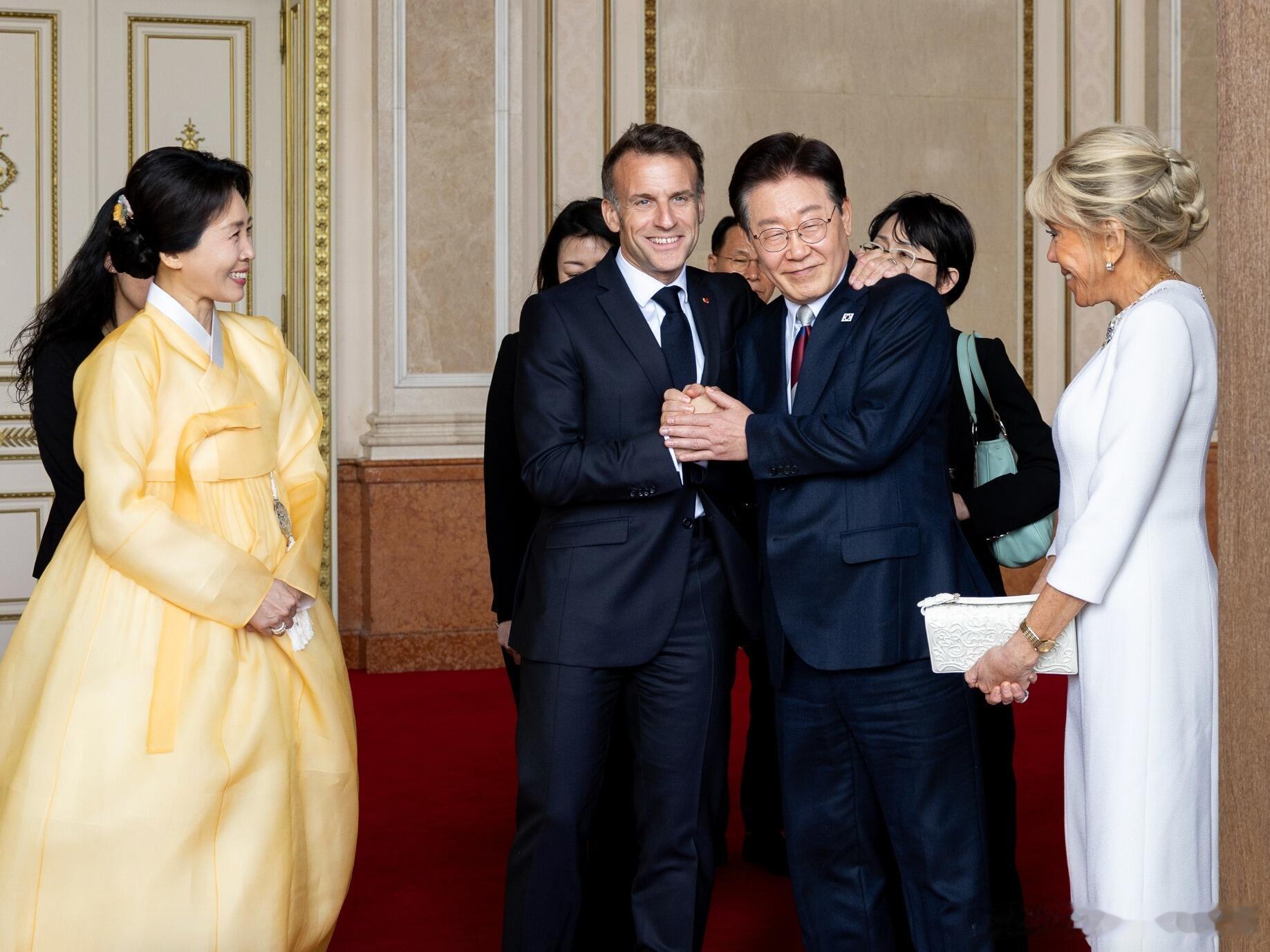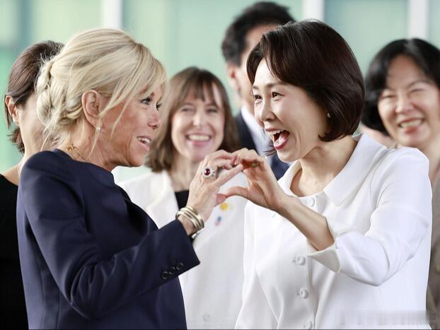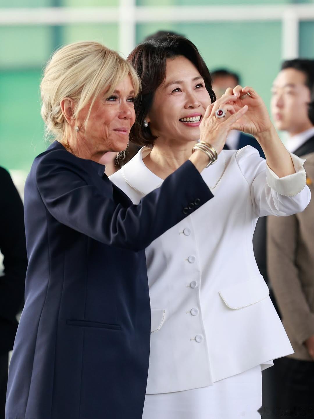 法国总统马克龙携夫人访韩,两国第一夫人的合影与互动。