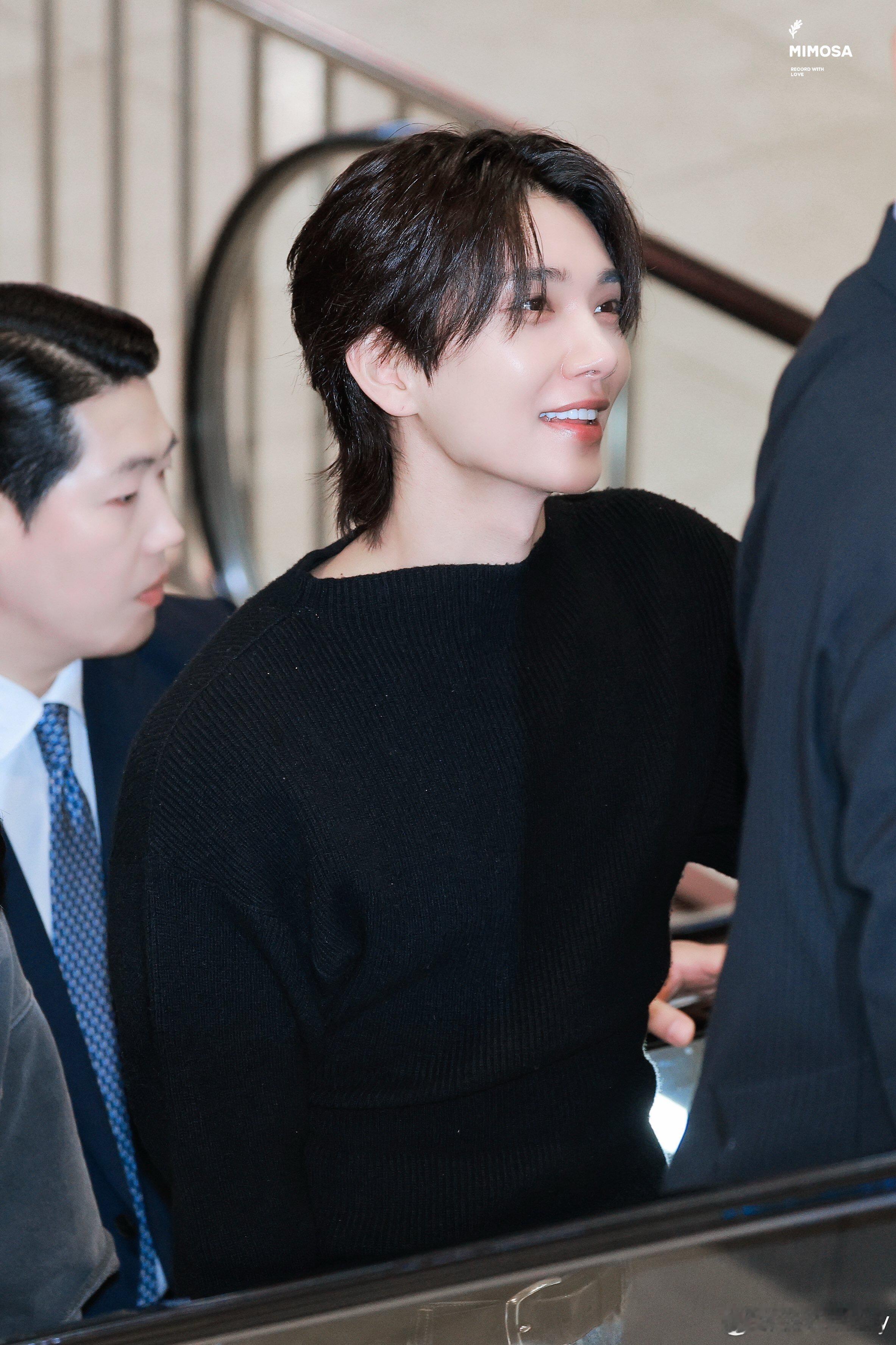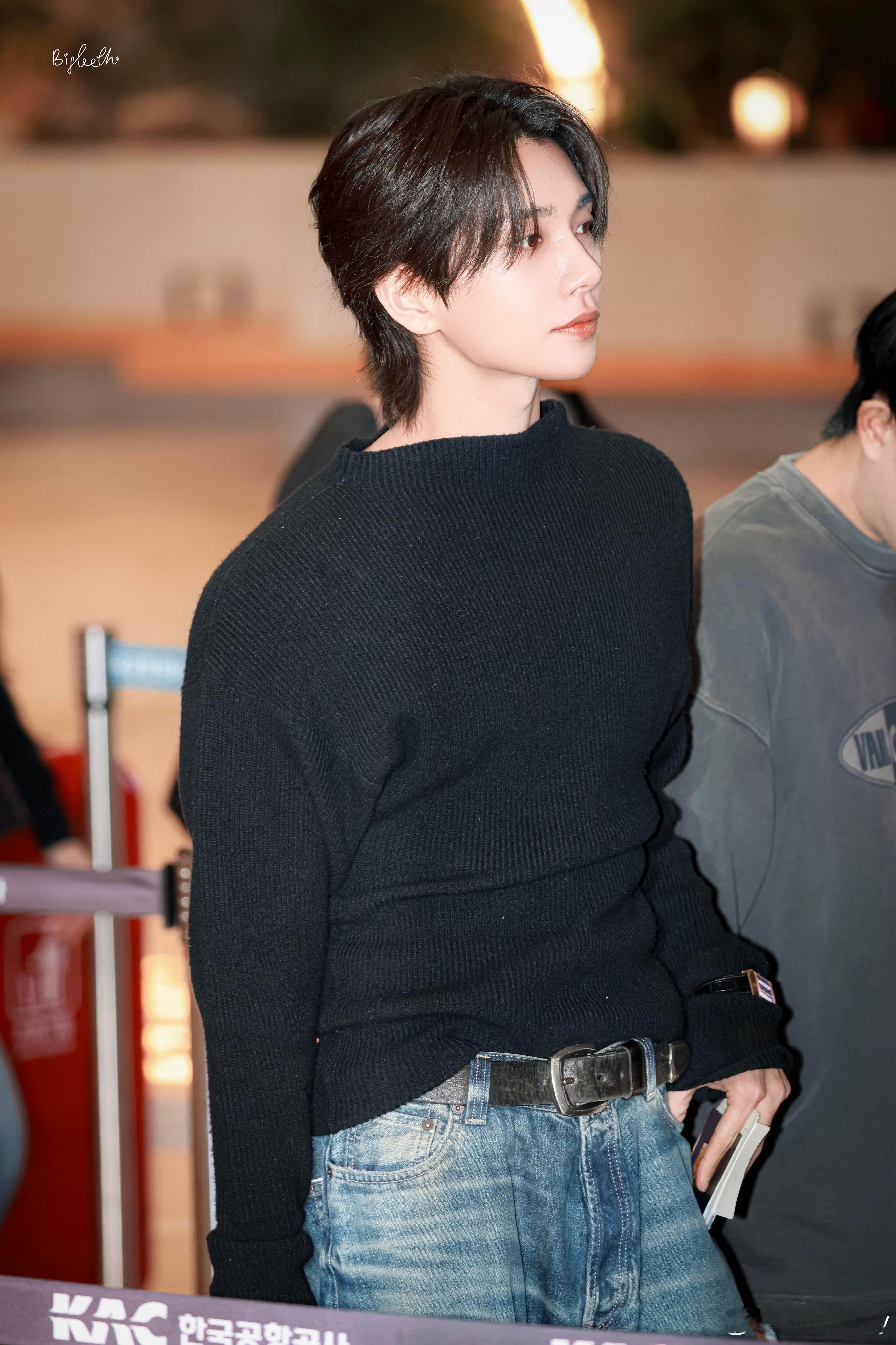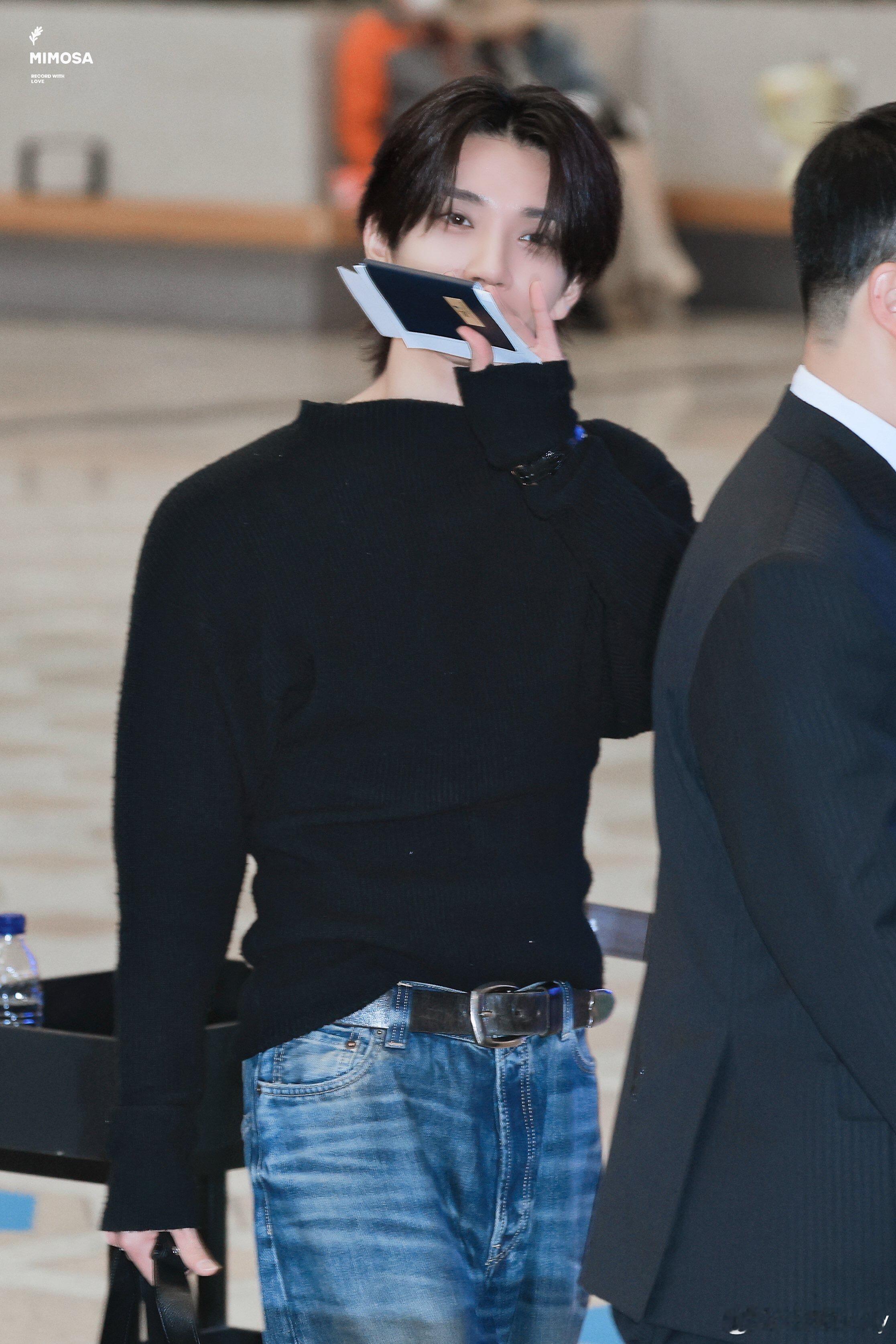 洪知秀4.9✈️Joshua 洪知秀今日机场穿搭,黑色针织毛衣下搭阔腿牛仔裤配厚