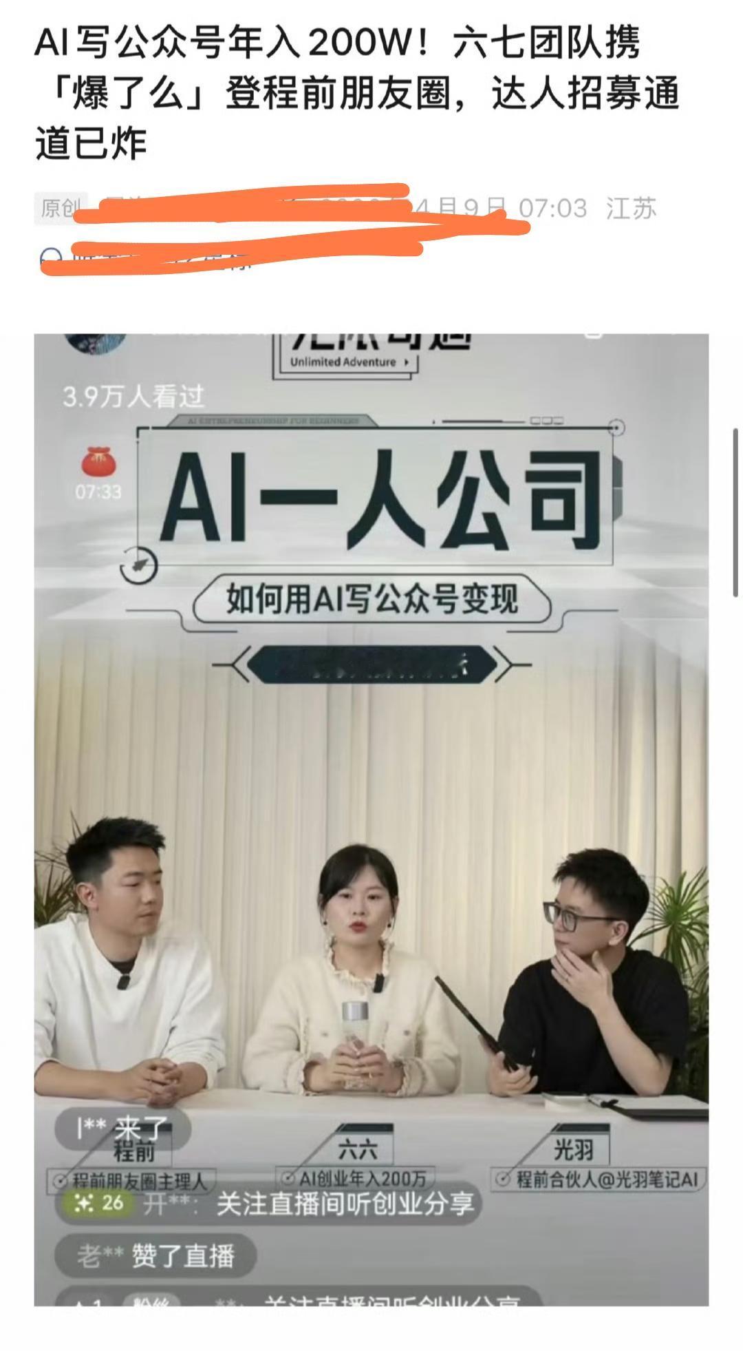 一对夫妻俩靠AI写公众号,吹自己年入200万,单篇文章收益都能飙到6000+,转头就搞了个AI创作平台,开直播到处吹“AI一人公司”的暴富神话,全网吆喝着招达人、教变现,恨不得把“靠AI赚翻了”刻在脑门上。