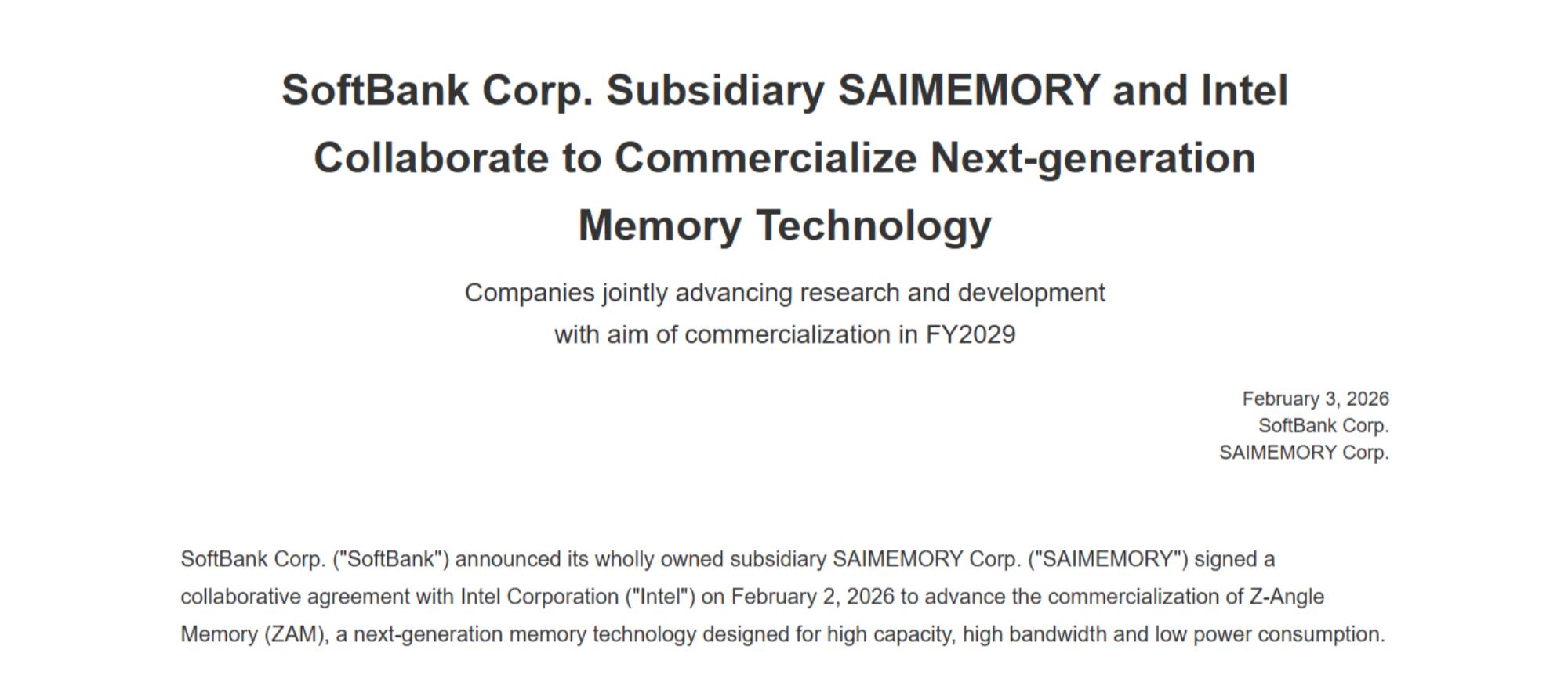 二、Saimemory去年12月成立,依托英特尔技术积淀推进研发据软银今日公告,Saimemory成立于2024年12月,是软银集团旗下专注于下一代存储技术商业化研发的全资子公司,此次与英特尔的合作,也是其成立后的重要核心布局。