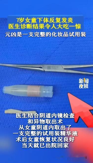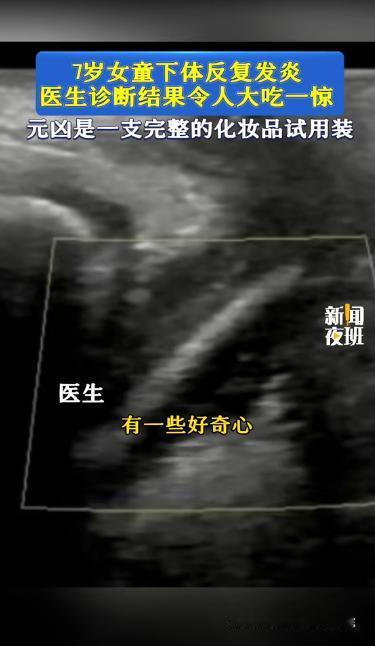 “万万没想到!”近日,广东,一7岁女孩阴道炎反反复复,家长试过什么办法都不见好,无奈只能去医院,经过医生耐心询问,才知道女孩一个月前,曾放了个圆珠笔粗细的东西进去,用内镜一看,女孩的阴道内竟卡着一支试用装精华液!