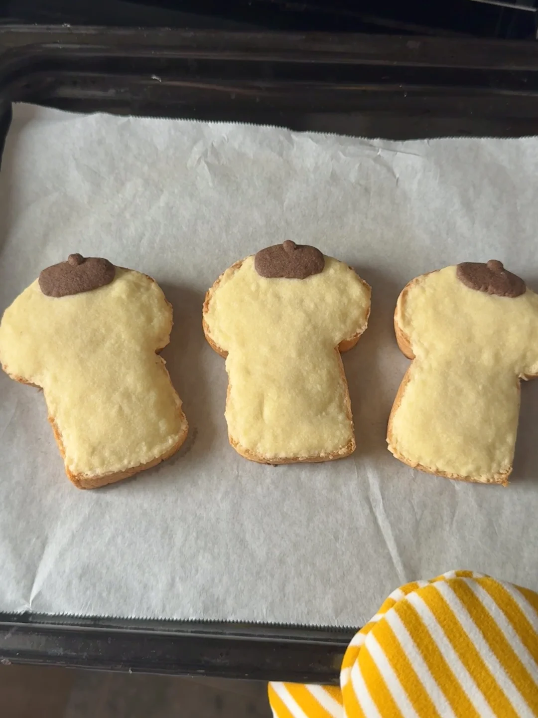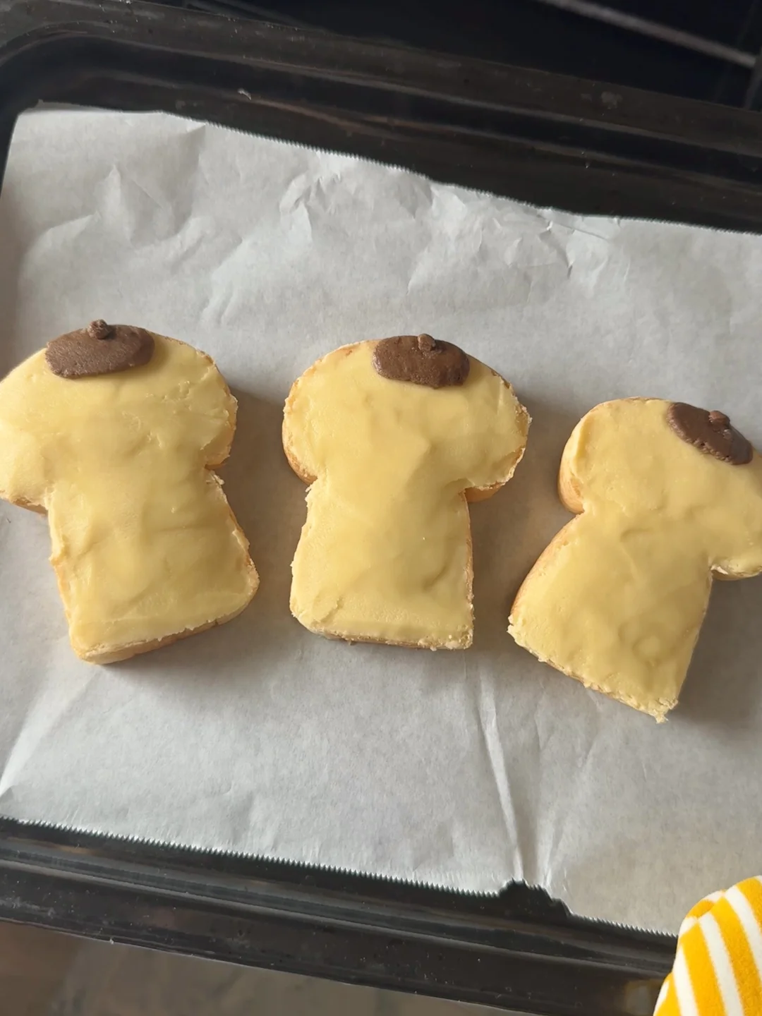 2️⃣把奶酥均匀涂抹在吐司上,放入预热好的烤箱200度烤12分钟,烤好的吐司用巧克力酱画上表情就好啦
