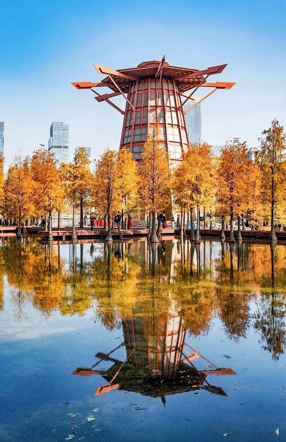 这里湖边成片的落羽杉与千灯湖水景、栈道、亭阁相交辉映,构成独特的自然与人文相结合的景观。落羽杉的树干和枝叶倒映在清澈的湖水中,宛如一幅油画。最特别的是每日固定时段还开启雾化装置,更是烟雾缭绕,如诗如画。