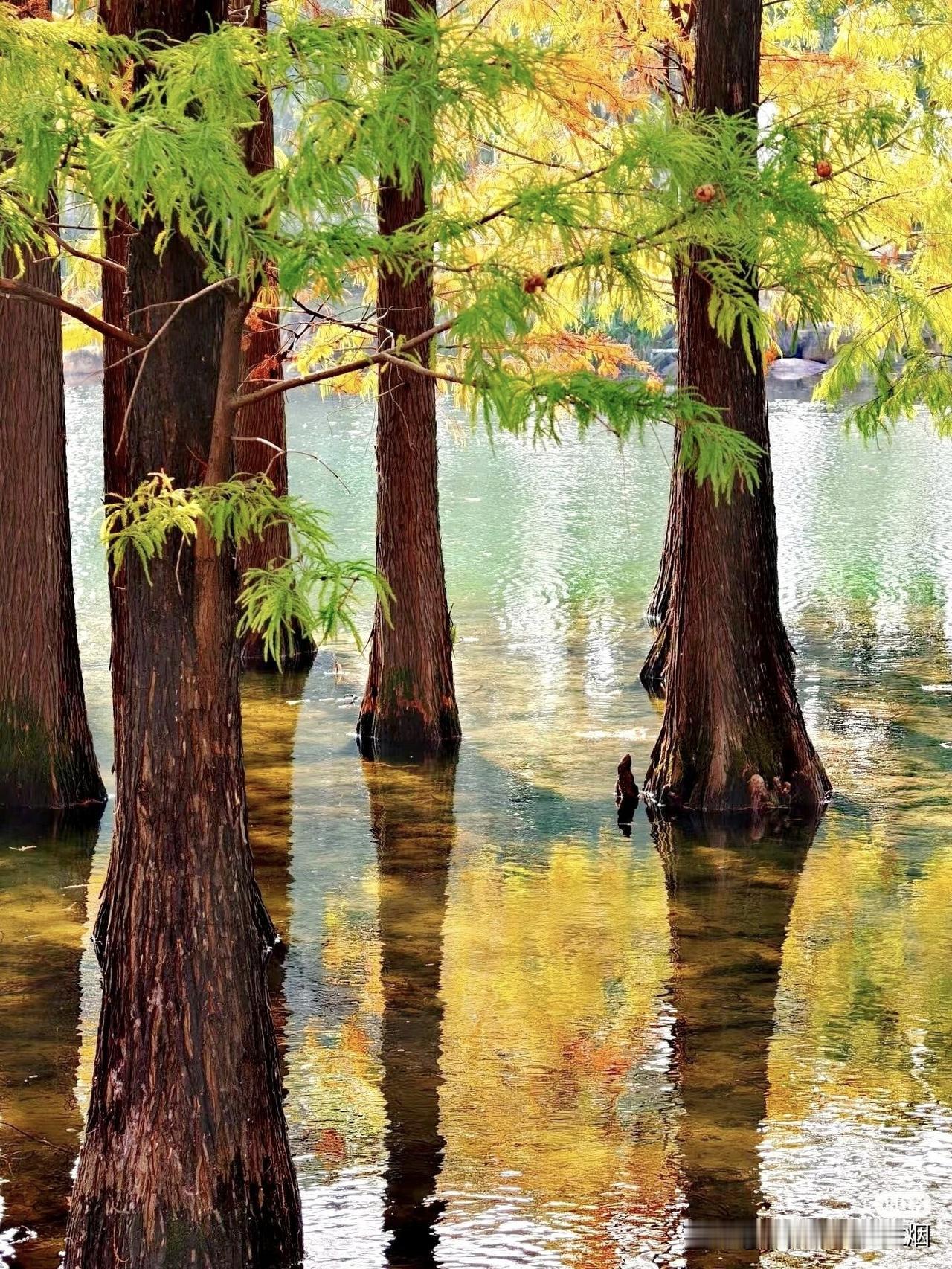 水影杉影交织,是大自然最灵动的笔触,午后的阳光穿透树叶缝隙,犹如自带柔光滤镜,温润而柔和,置身其中似乎有点恍惚,犹如身处画中。