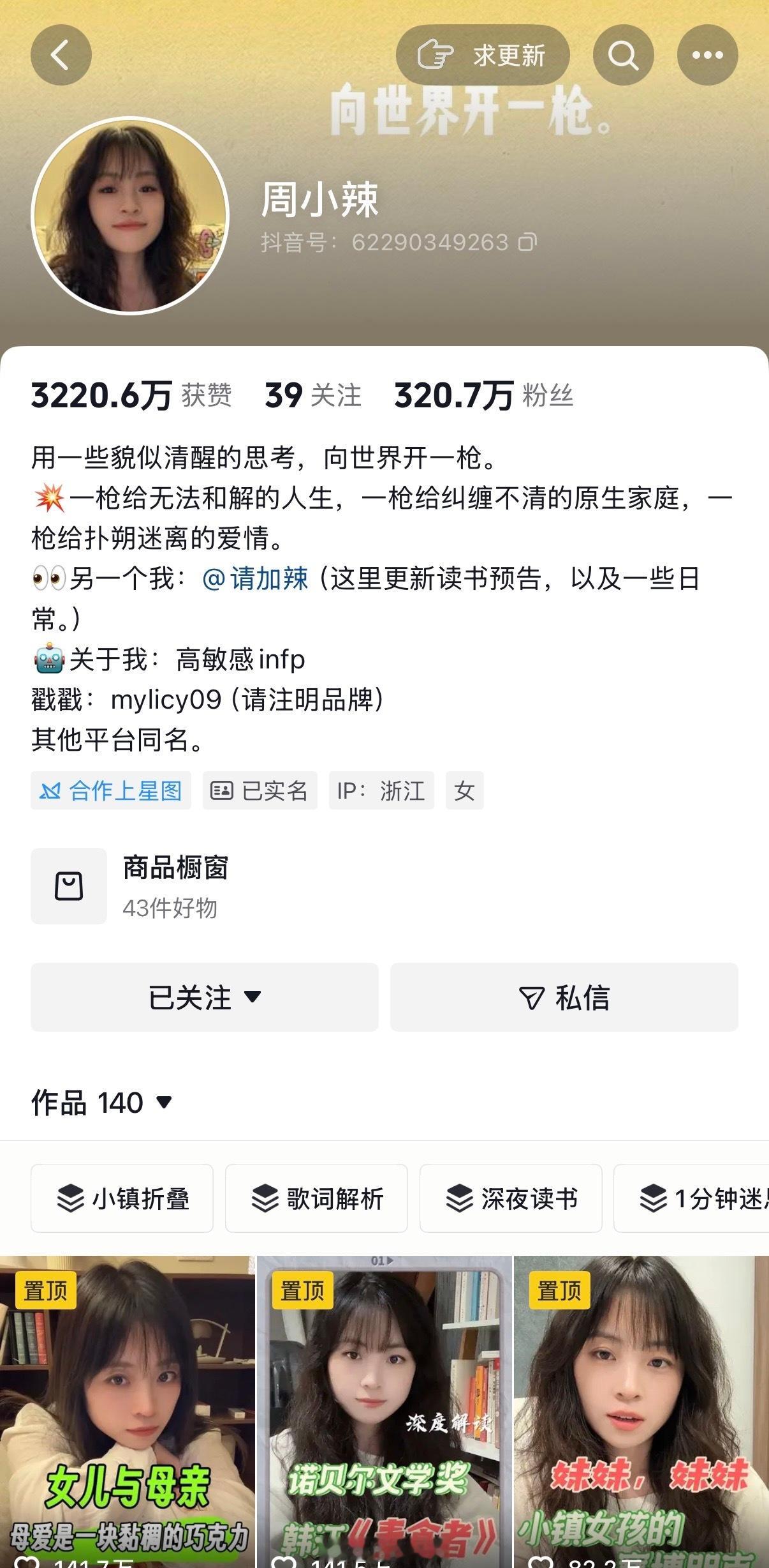 1、周小辣第一次刷到她,是她那条《为什么我不敢拒绝别人?》,她就是坐下来,用自己的经历慢慢讲——从小镇到杭州,从不敢说到学着说,从讨好到自洽。她说自己也是高敏感、INFP、讨好型人格,这些词我都熟,但第一次听一个人用这么平静的语气说出来,非常的坦然自若。她还用非常通俗的语言讲解《百年孤独》《窄门》《飘》这些经典著作,带着大家一起深度解析思考,尤其擅长梳理复杂人物关系与情感内核。她就像一杯温水,不烫嘴,但喝下去全身都暖了。