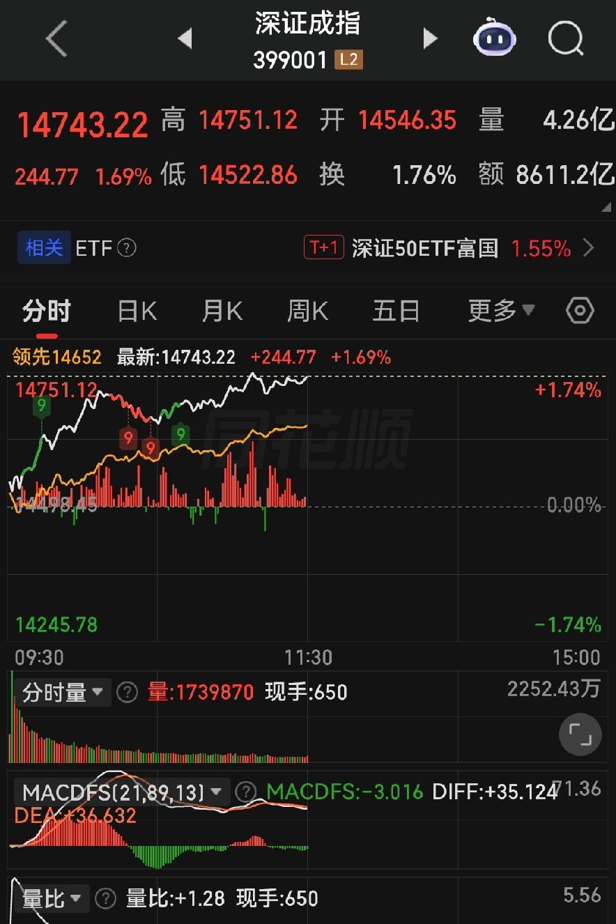 到中午收盘,你们看哈数据:沪指涨0.53%,报4048点;深证成指涨1.69%;最凶的是创业板指,直接涨了2.66%,一冲冲到3608点,硬是刷新了近11年的历史新高!整个市场3856家股票都是红的,半天成交额就干到14618亿,比昨天上午多了一大截,钱就跟不要钱一样往里头拱。还有宁德时代,更是不得了,总市值直接把中石油、工商银行都甩到后头,坐到A股第二把交椅,风光无限!