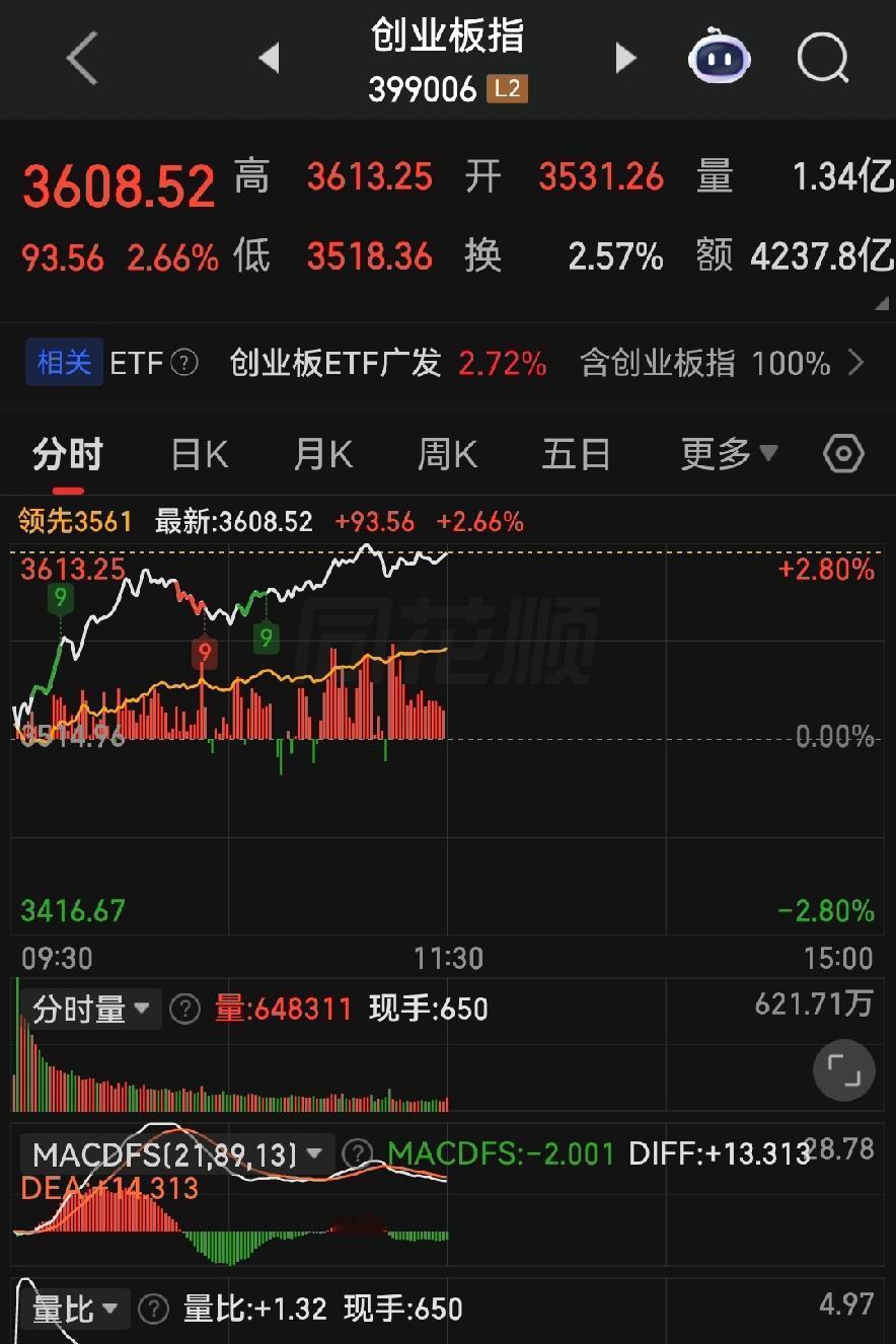 第二个,创业板涨太凶,获利盘堆起太厚了!创业板前面已经五连阳,硬生生涨了12%多,今天上午又猛冲2.66%,创了11年新高。新高是好看,但老话说得好,爬得越高摔得越疼!那些低位买进去的人,现在哪个不是心头打小算盘?想的不是再涨好多,而是赶紧卖了落袋为安,把钱揣到包包头才稳当。下午只要有一个人带头砸盘,跟风盘绝对跟多米诺骨牌一样,哗啦啦倒一片,想跑都跑不赢!
