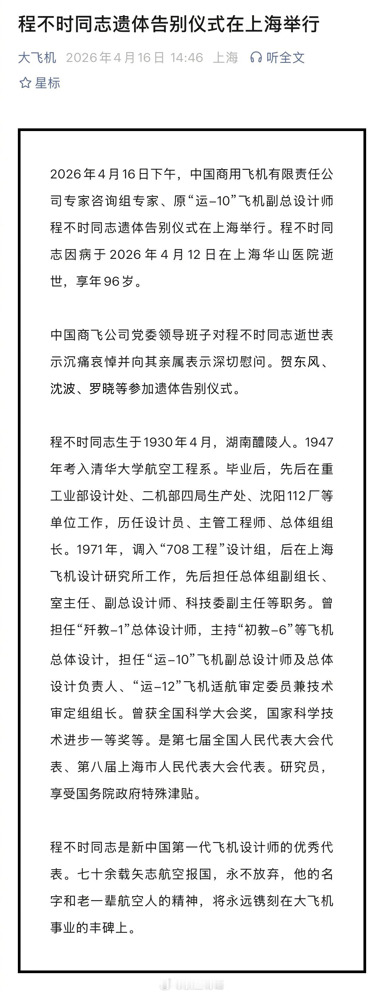 【国产大飞机重要见证人 运-10飞机副总设计师程不时逝世】来自商飞的消息,原“运-10”飞机副总设计师、中国商飞专家咨询组专家程不时同志因病于2026年4月12日在上海华山医院逝世,享年96岁。