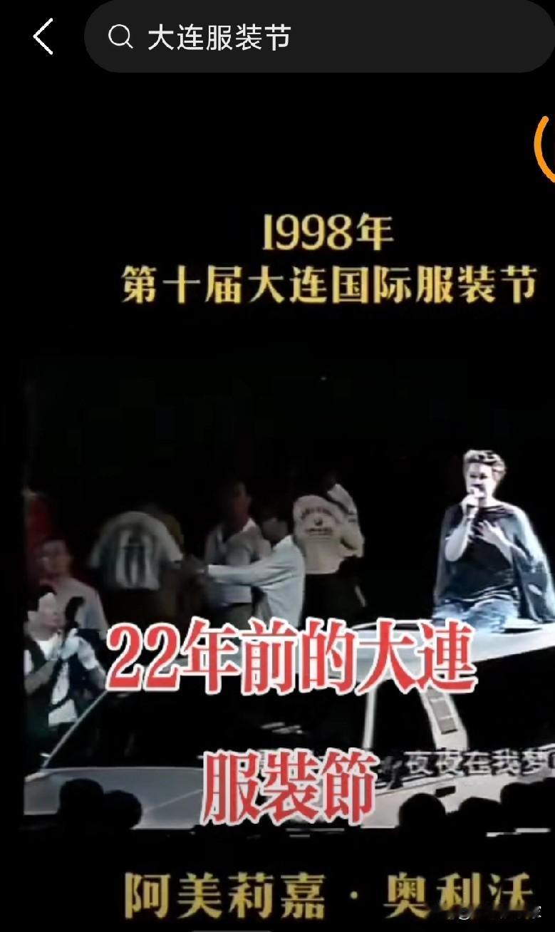 本人在网上观看了曾经大连国际服装节广场艺术晚会的视频。记得当年电影《泰坦尼克号》的主题曲《我心永恒》(英文名《My Heart Will Go On》)挺火的,当时,大连服装节晚会时就请来了一位女星唱这首歌,不过,当时并没有请这首歌的原唱席琳·迪翁(不知道是没有档期还是出场费太贵),而是请了一位美国女演员阿美利加·奥利芙(也有音译阿美利加·奥利沃)演唱这首歌。不过,可能因为这种事比较久远,某些网友误以为当时大连服装节把席琳·迪翁请来了,其实,真不是这样。