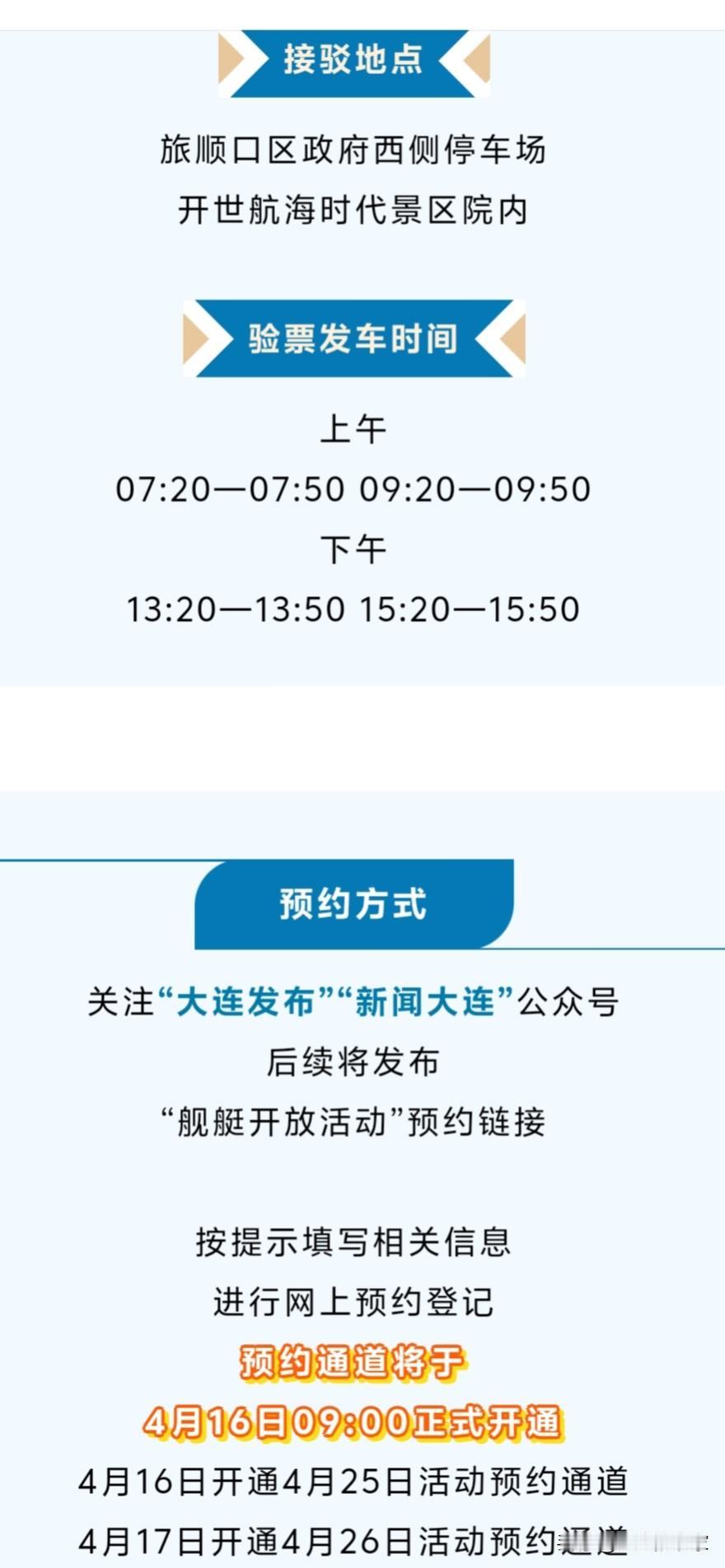 活动当天有接驳车送参观者参观,接驳车,接驳车停靠地点:旅顺口区政府西侧停车场,开世航海时代景区院内核验抢票是否成功。