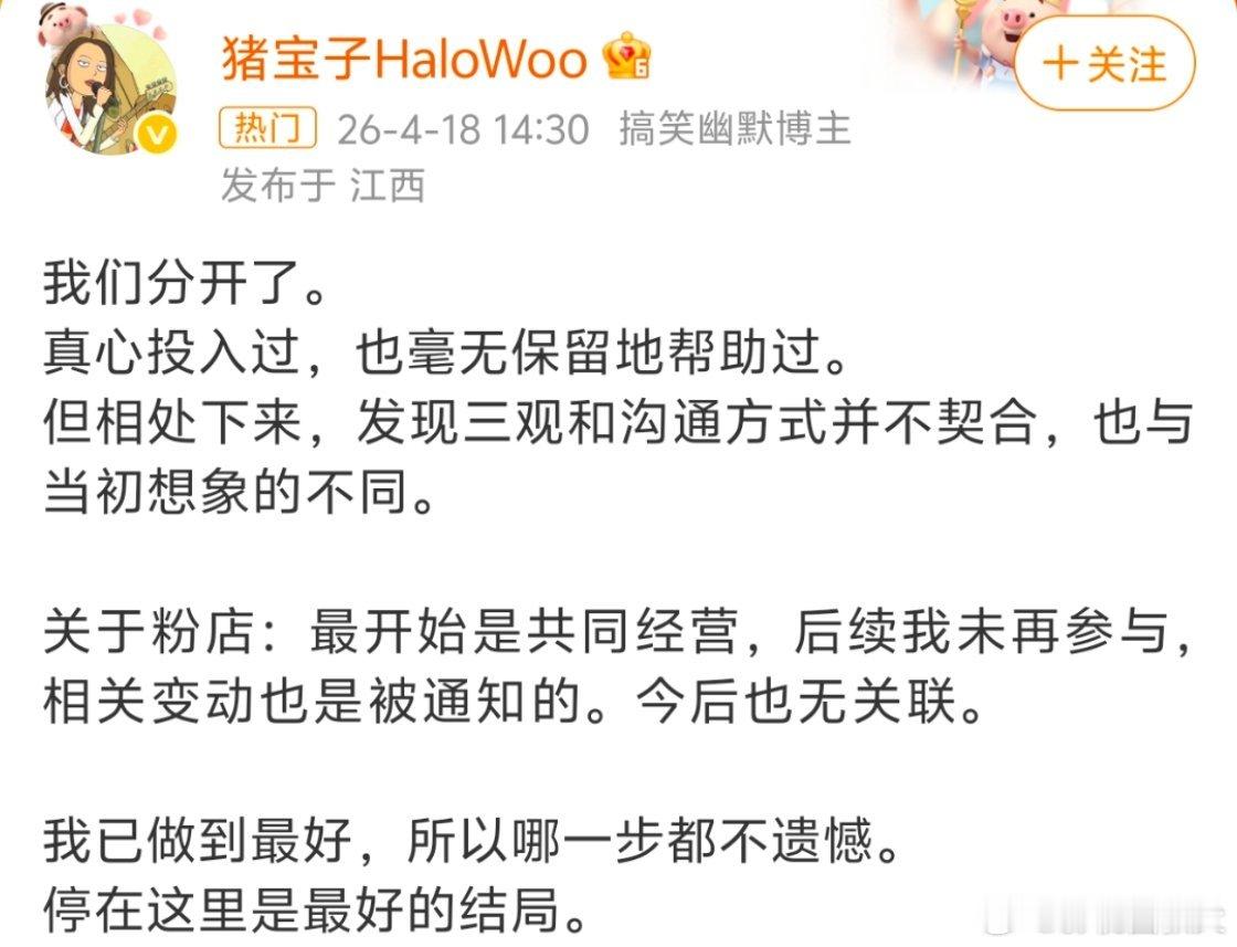 猪宝子星星分手百万粉博主猪宝子官宣和男友星星分手了。他俩之前被当成“爱情范本”,还高调求过婚,现在说因为三观不合、沟通不畅分开,合开的拌粉店后续也和她无关,网友都在感慨曾经的“青梅竹马”还是散了