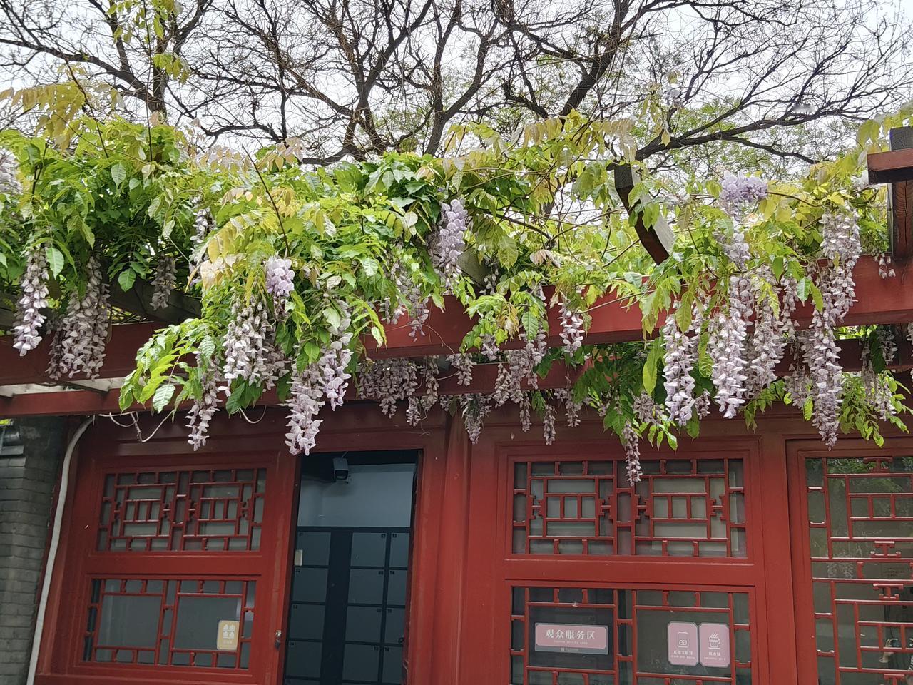 进万寿寺山门,慧日长辉殿的门前,盘在古树上的古藤已经零星开花,古藤上还在输着液体。一位游人老先生说,这紫藤都把古树快盘S了。殊不知,紫藤作为伴生藤本,一般是与古建古树同栽或移栽。万寿寺这棵紫藤是古藤,就是依伴古柏生长的。