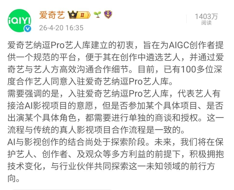 爱奇艺回应艺人AI制作合作龚宇火速澄清:爱奇艺纳逗艺人库列出的艺人仅为合作接洽意愿,未敲定任何项目,张若昀、于和伟均不在名单。全程平移传统合作规则,艺人拥有角色最终决策权,所有合作单独授权,尊重艺人权益,谨慎探索AI影视。爱奇艺CEO回应AI艺人库争议