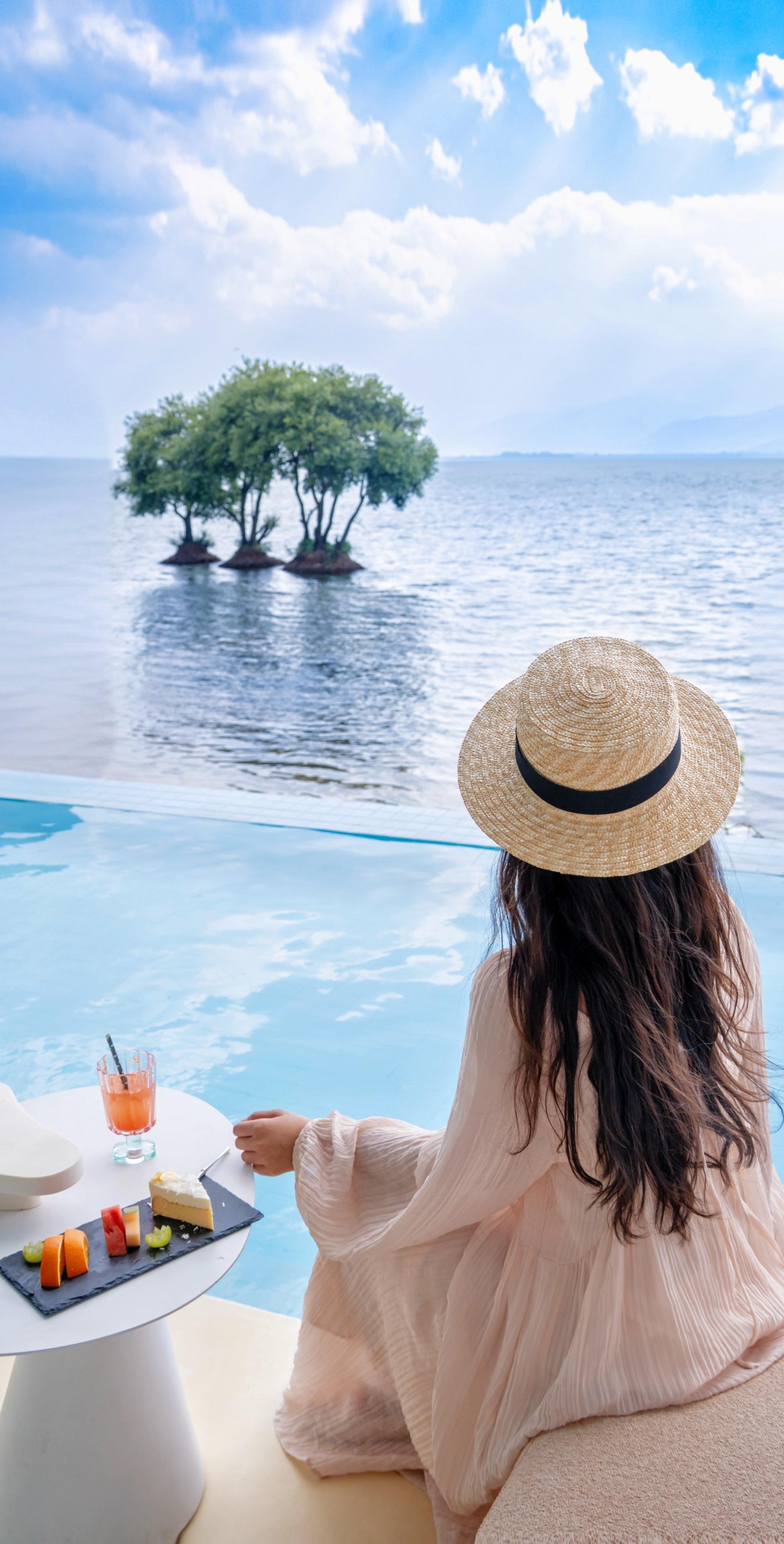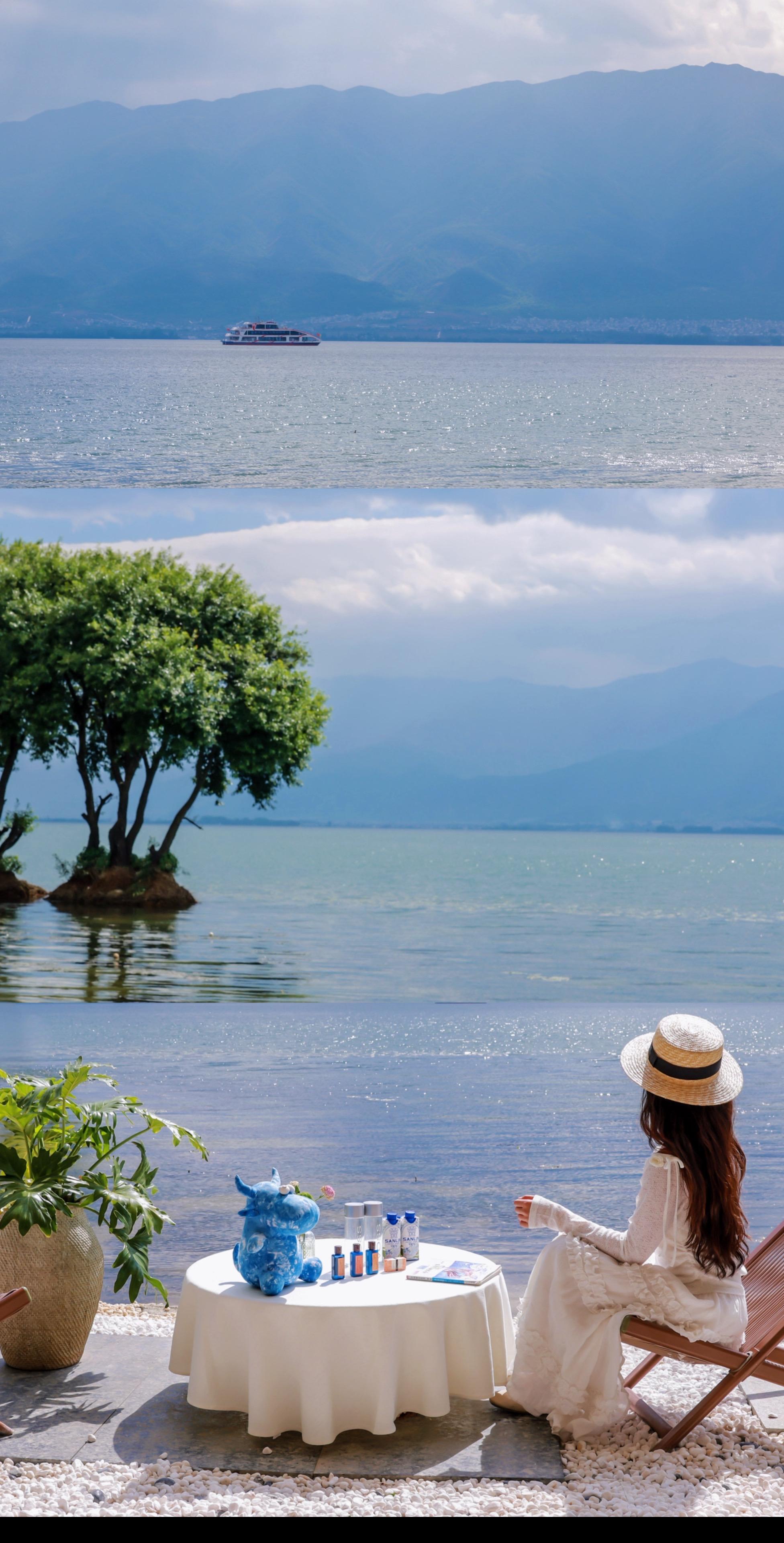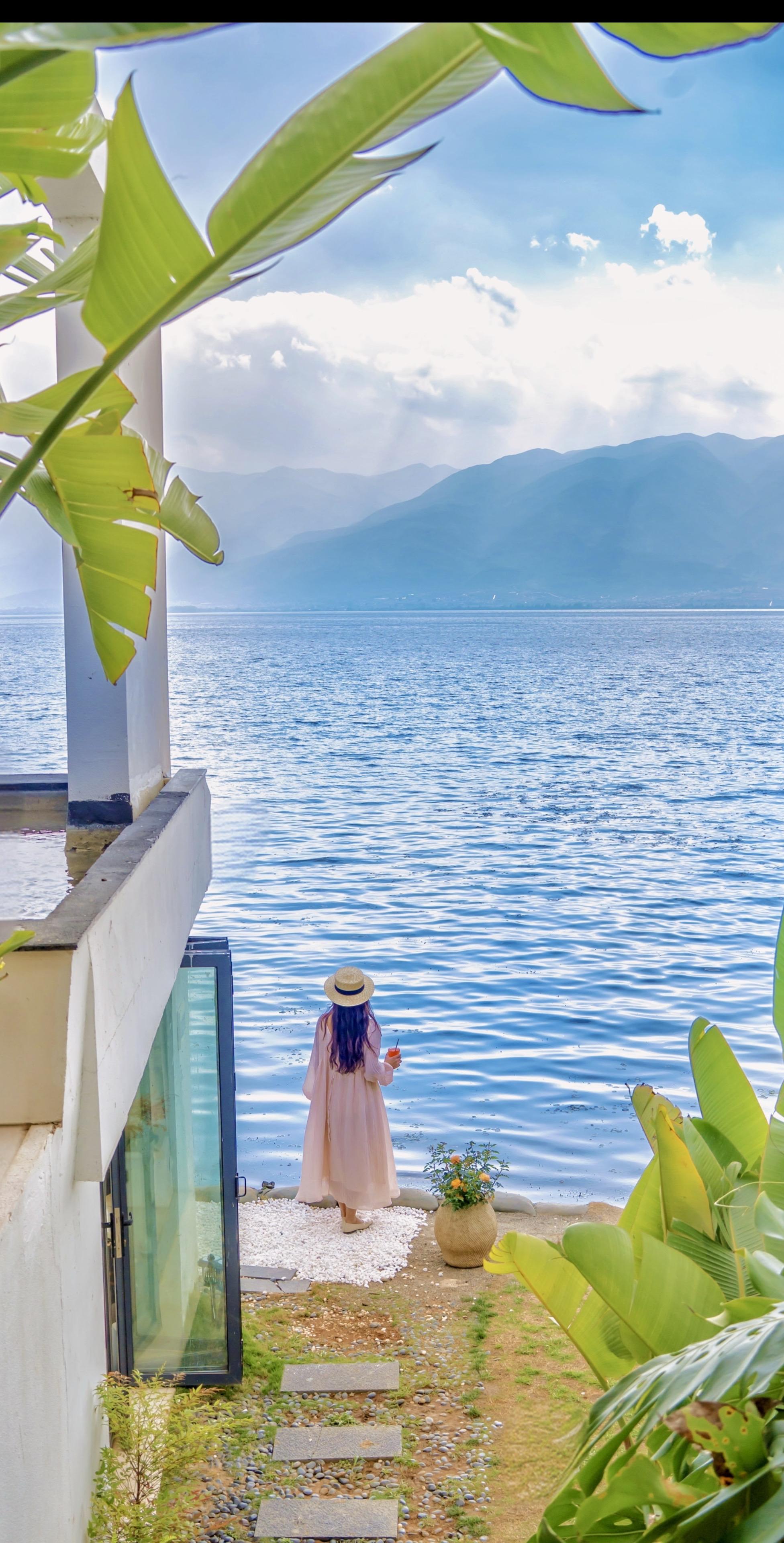 270°落地窗,洱海湖畔的三颗树倒影着黄昏,在这里和闺蜜一起下午茶,看海,聊天……