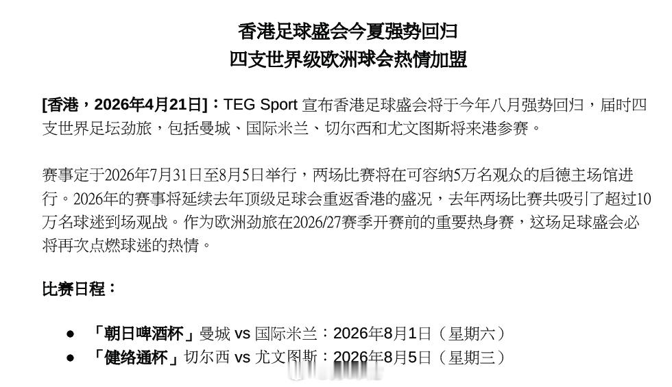 终于官宣了,今年夏天,香港,曼城vs国米切尔西vs尤文,加上之前的拜仁维拉,这也