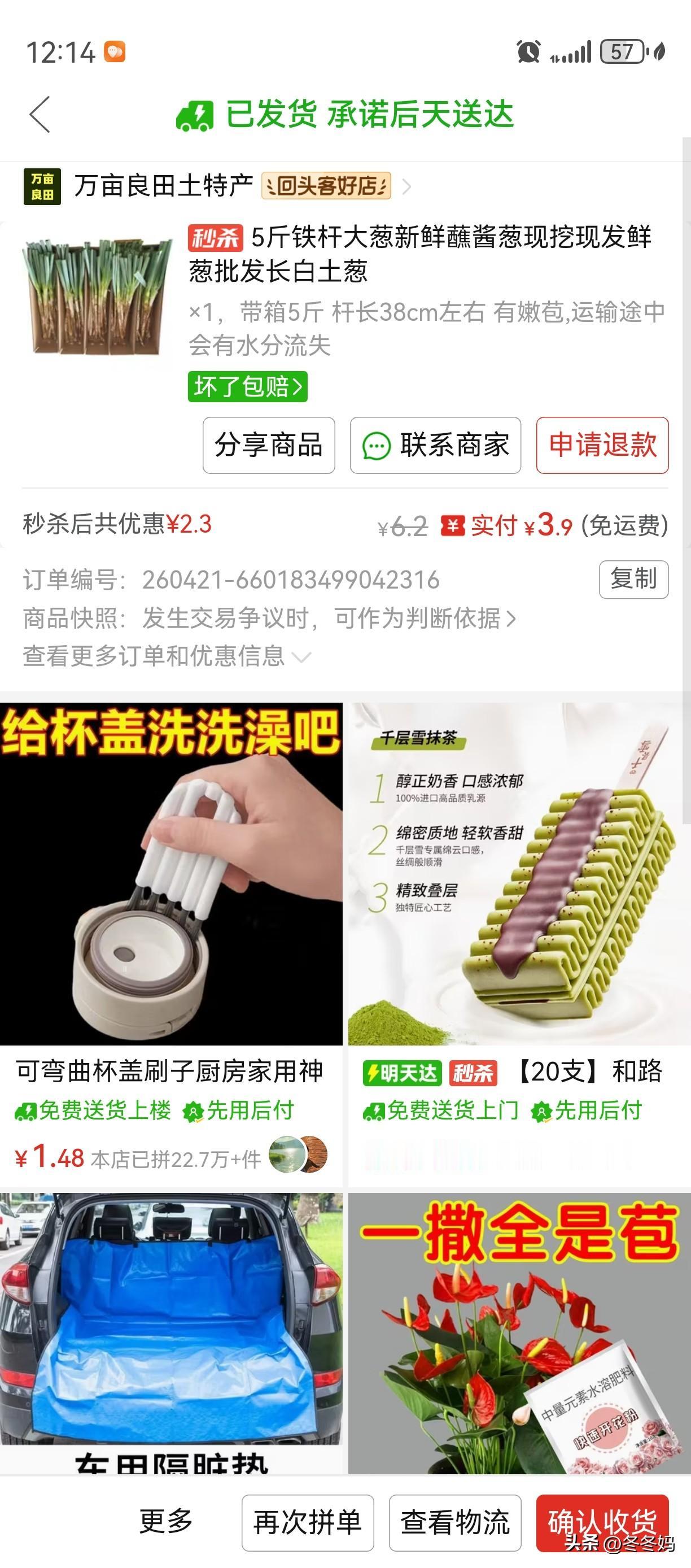就说今天我买的花露水,是在旗舰店买的。188毫升装的,超市里一瓶卖19块,拼多多上22块能买两瓶。还有拖鞋也是品牌的。买的大葱,超市里差不多两块钱一斤,这边一块钱一斤都不到,还送货上门。我又秒杀了一些面包。