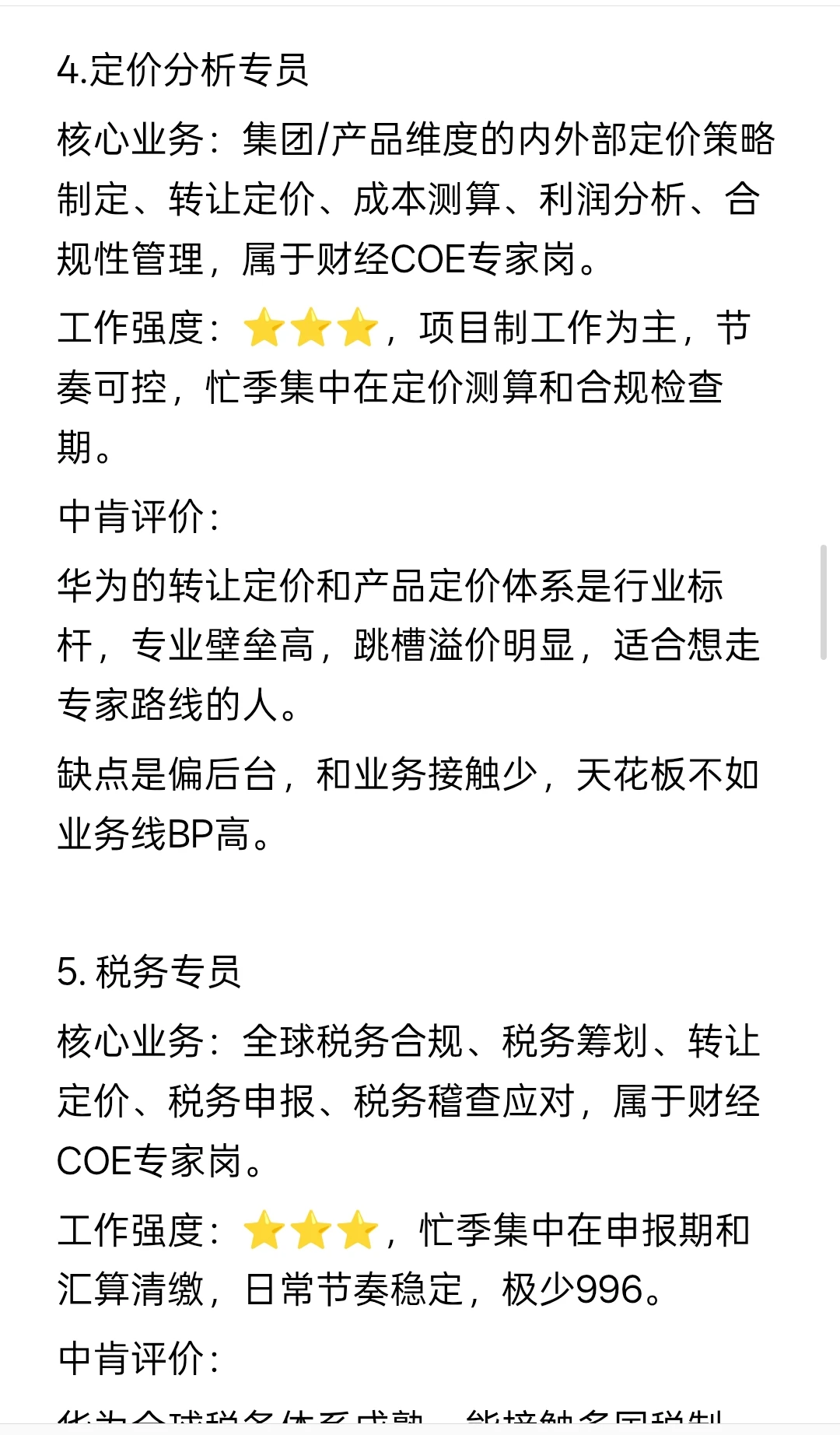 华为的转让定价和产品定价体系是行业标杆,专业壁垒高,跳槽溢价明显,适合想走专家路线的人。